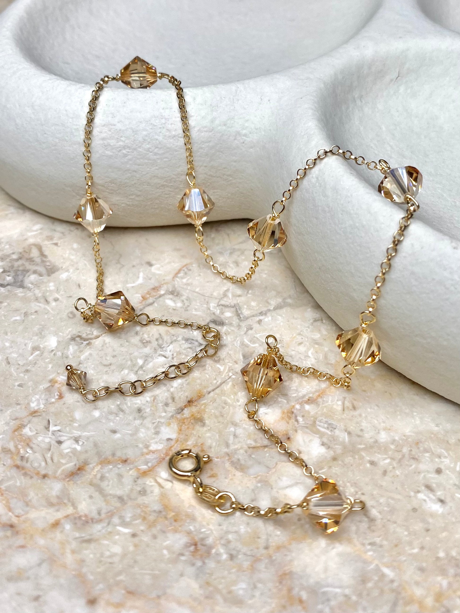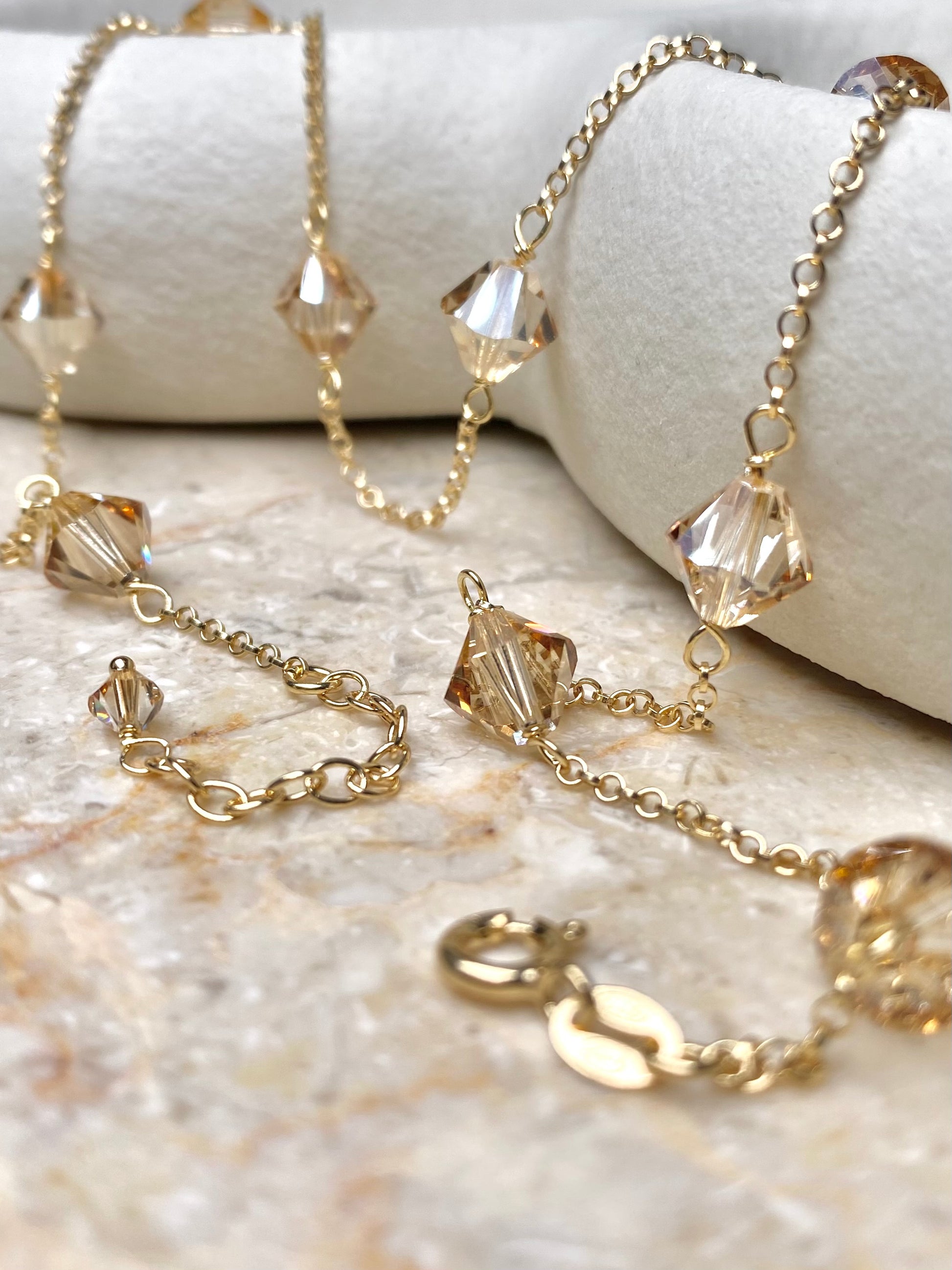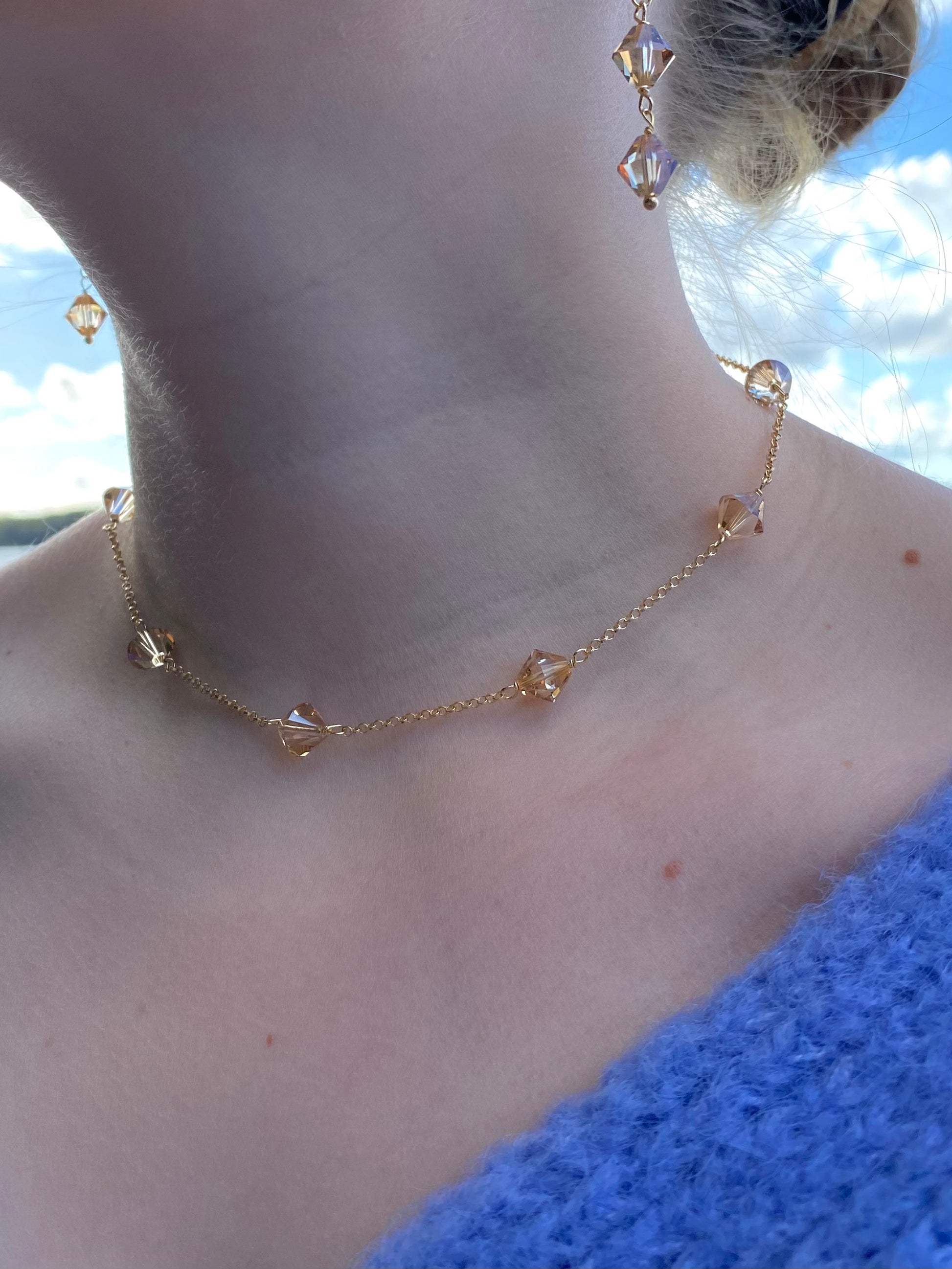 Aarteeni-kaulakorun ketju ja muut metalliosat ovat kierrätettyä 18K kullattua 925 sterling hopeaa. Koru on koristeltu itävaltalaisilla kristallilasihelmillä.