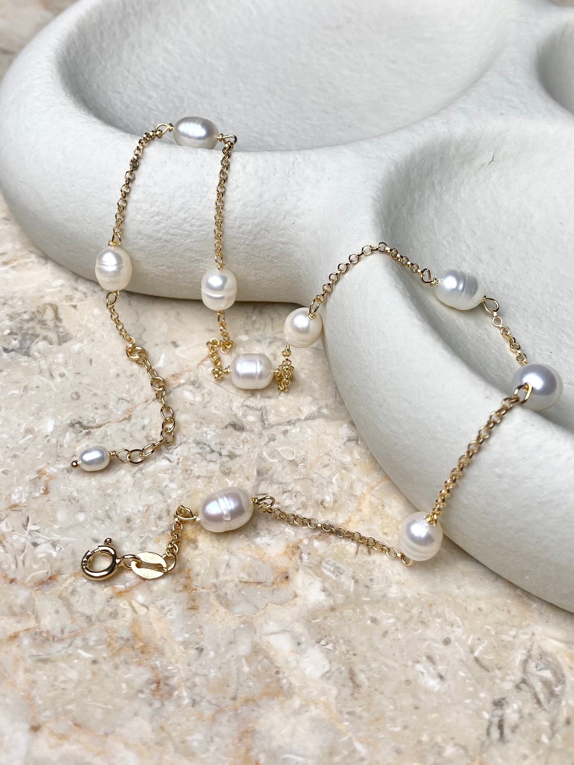 Aarteeni-kaulakorun ketju ja muut metalliosat ovat kierrätettyä 18K kullattua 925 sterling hopeaa. Koru on koristeltu makeanvedenhelmillä.