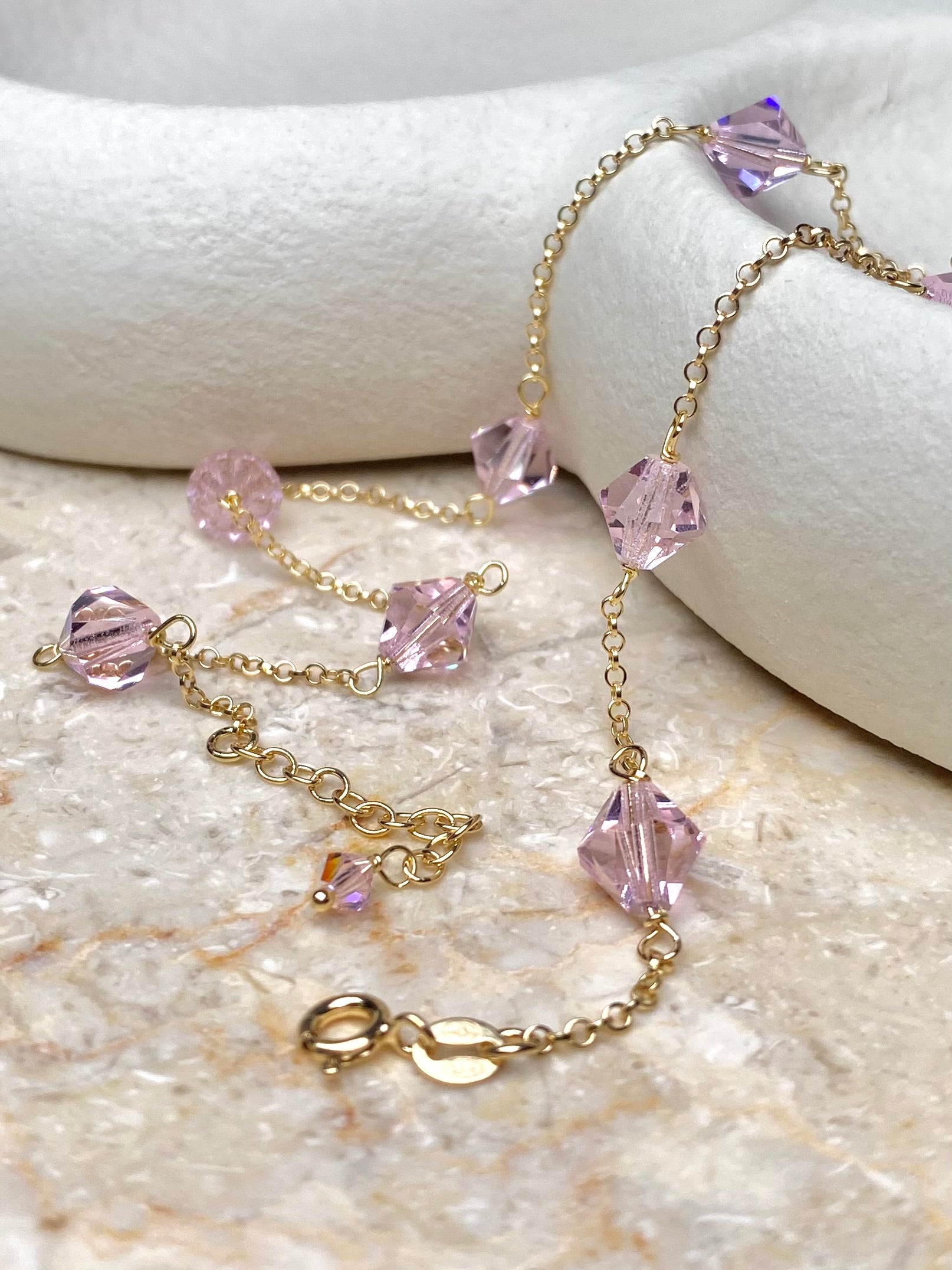 Aarteeni-kaulakorun ketju ja muut metalliosat ovat kierrätettyä 18K kullattua 925 sterling hopeaa. Koru on koristeltu tšekkiläisillä kristallilasihelmillä.