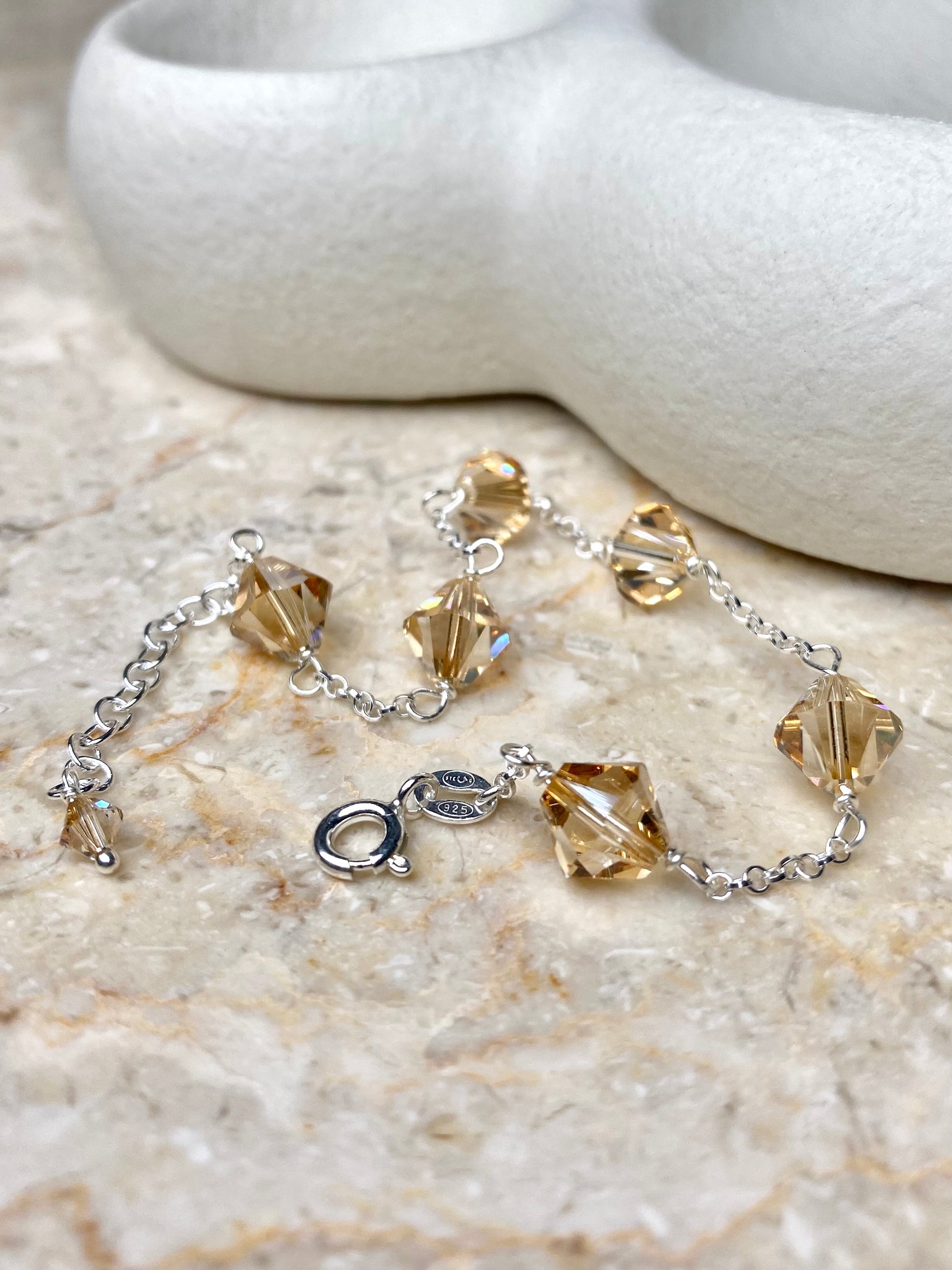 Aarteeni-rannekorun ketju ja muut metalliosat ovat kierrätettyä 925 sterling hopeaa. Koru on koristeltu itävaltalaisilla kristallilasihelmillä.