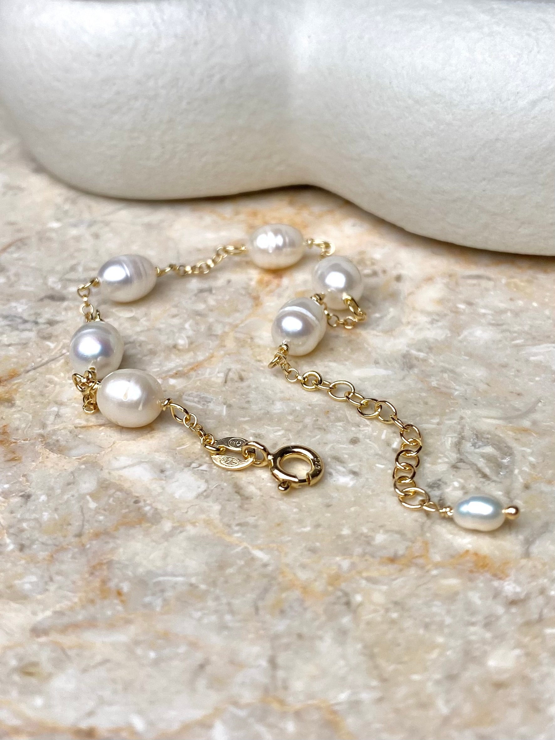Aarteeni-rannekorun ketju ja muut metalliosat ovat kierrätettyä 18K kullattua 925 sterling hopeaa. Koru on koristeltu makeanvedenhelmillä.