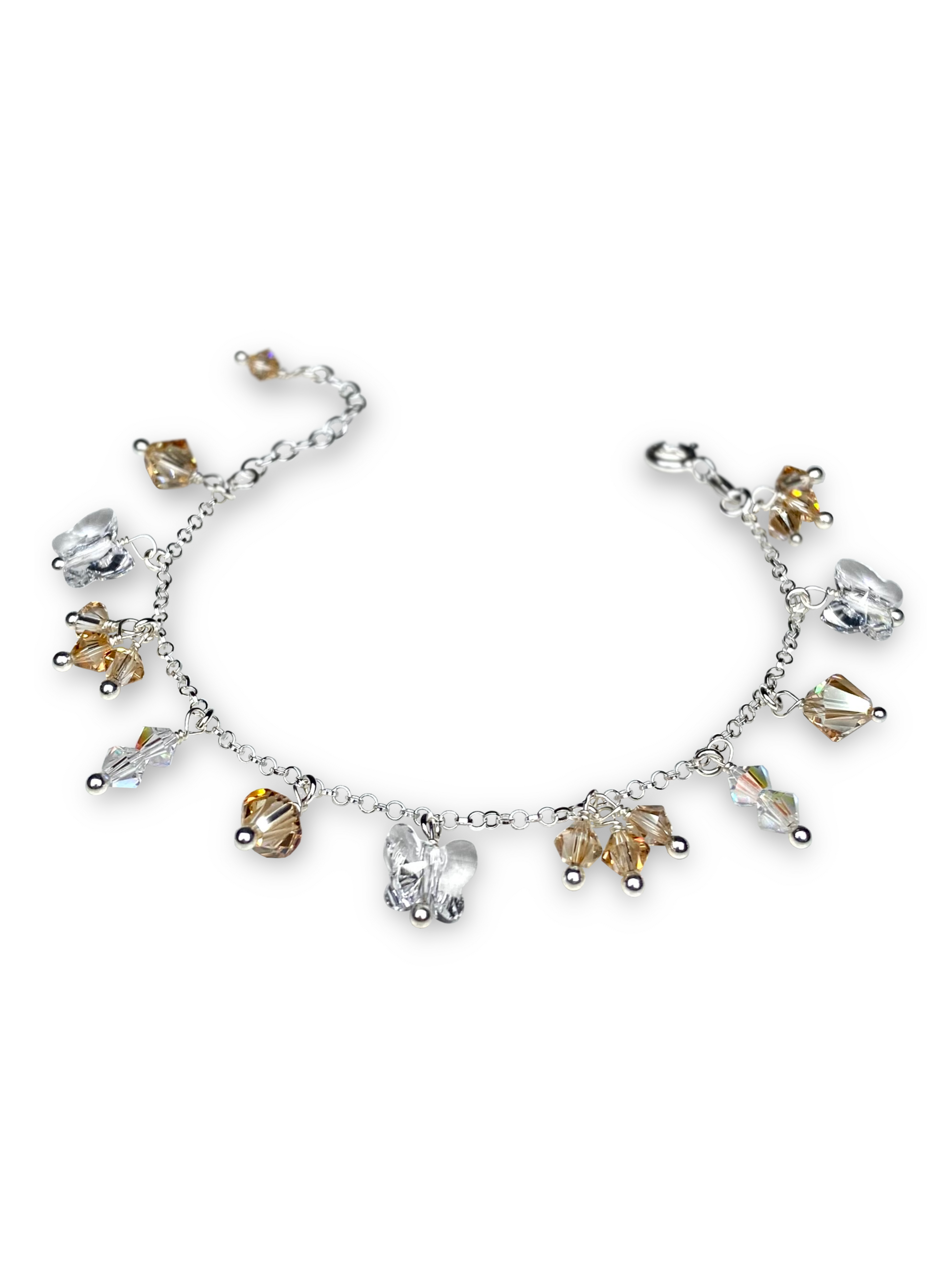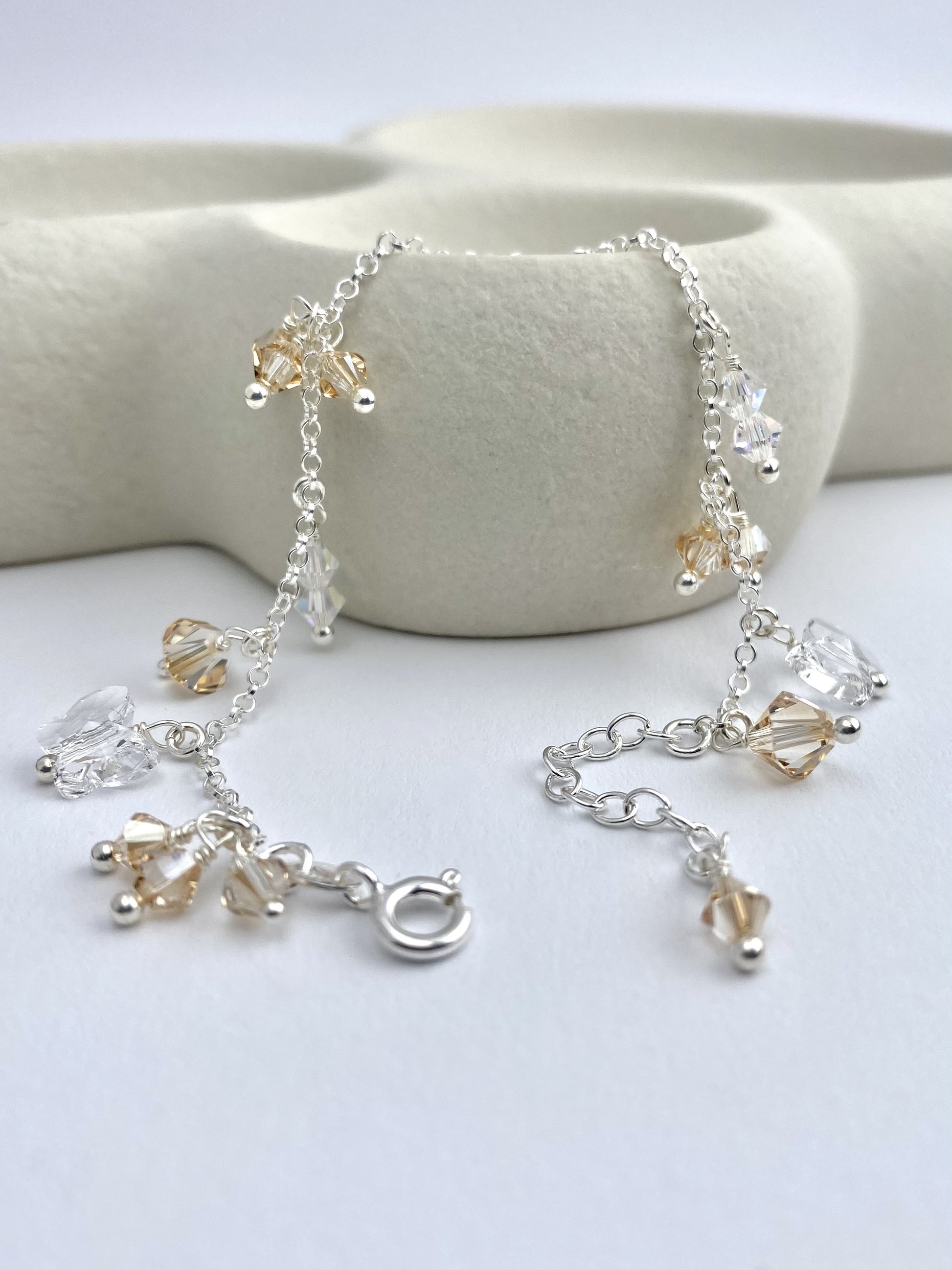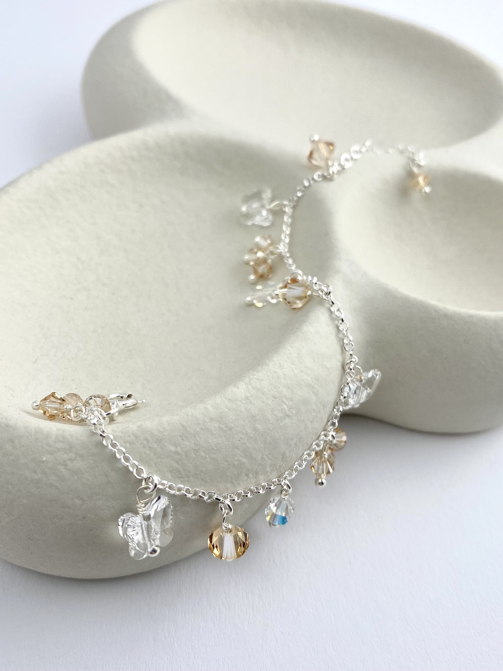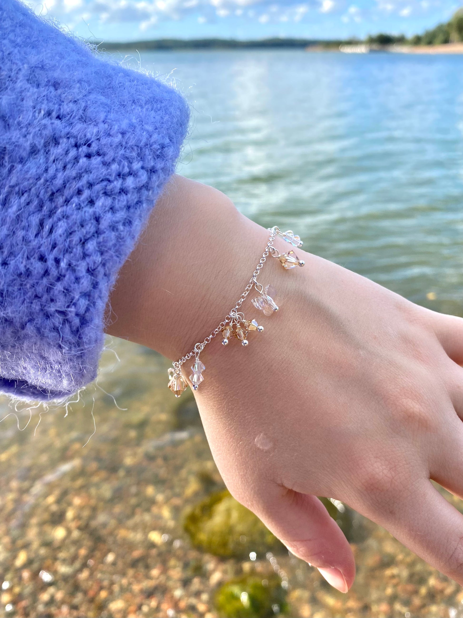 Siro, söpö ja suloinen Keidas-rannekoru sopii jokaiseen hetkeen. Tämä ihanuus on myös täydellinen lahja ystävälle, läheiselle tai puolisolle. Ohuen siro ketju luo kokonaisuudesta kevyen, mutta värikkäät kristallilasiriipukset tekevät korusta katseiden kiinnittäjän. Ketju ja muut metalliosat ovat 925 hopeaa. Ketjun pituus on 15 cm + 3 cm säätövara. Kaikki riipukset ovat käsin kiinnitetty yksi kerrallaan.
