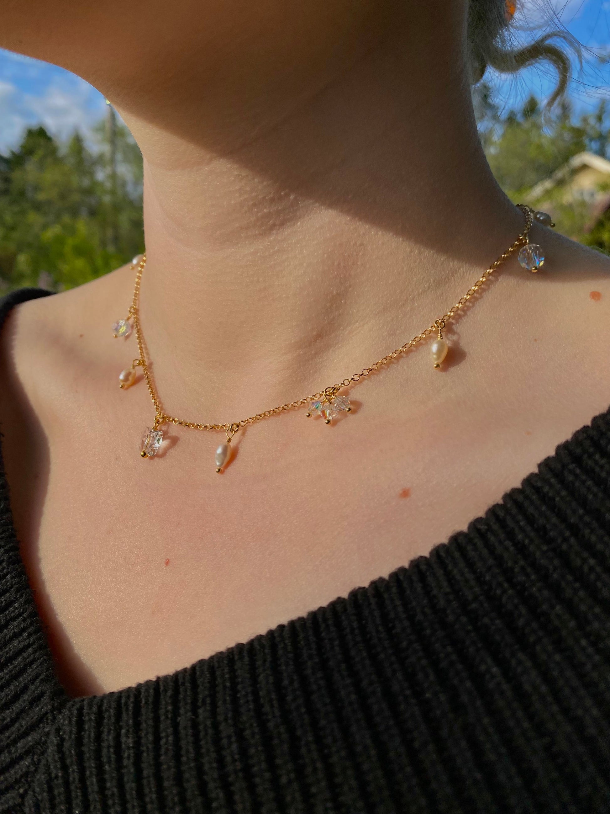 Asu kruunautuu yhdistämällä Keskikesä-korvakorut ihastuttavaan Mini Mini -kaulakoruun. Mini Mini -kaulakorussa on miniriipuksia ja minipituus, jonka ansiosta se istuu kauniisti rintakehän yläpuolella. Korua koristavat pienet kristalliriipukset ja makeanvedenhelmet. Koristeet jatkuvat koko ketjun ympäri, joten se ihastuttaa mistä päin tahansa katsottuna. Ketju ja muut metalliosat ovat 18K keltakullalla kullattua 925 sterling hopeaa. Ketjun pituus on 39 cm + 3 cm säätövara.