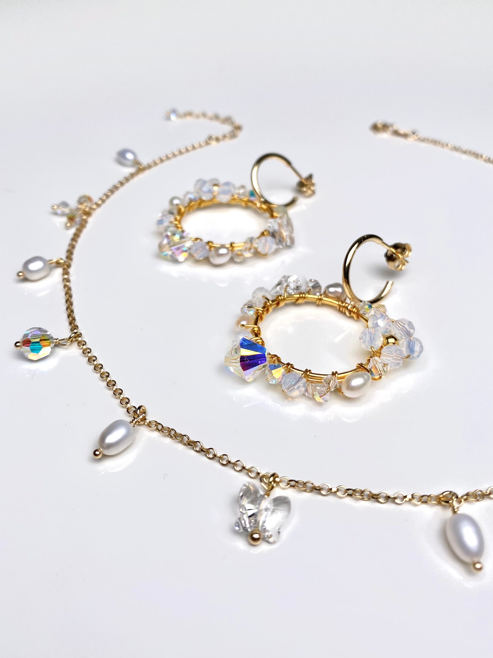 Materiaalit: 18K kullattu 925 sterling hopea, 24K kullattu kuparilanka, tsekkiläiset kristallilasihelmet, makeanvedenhelmet.