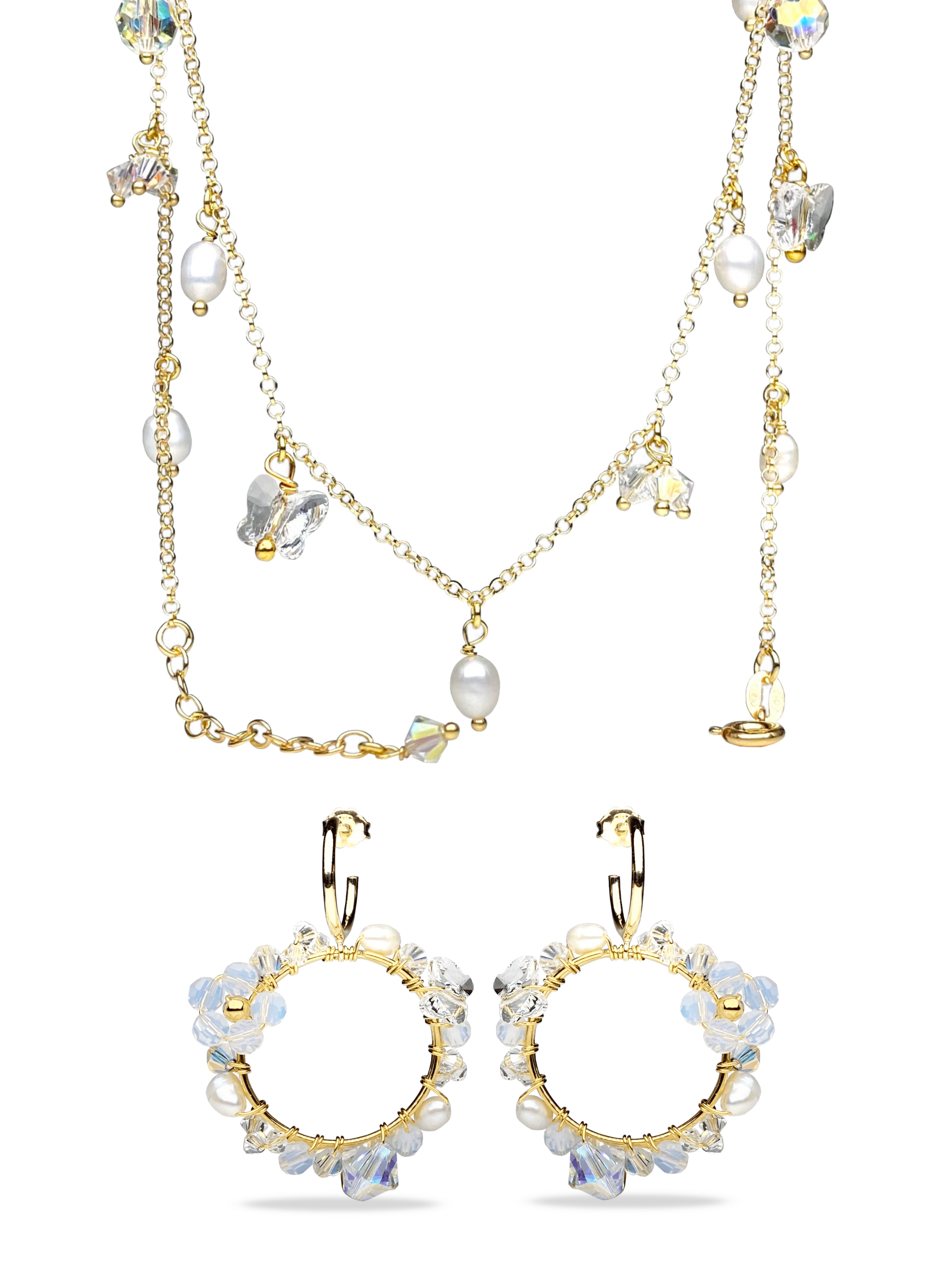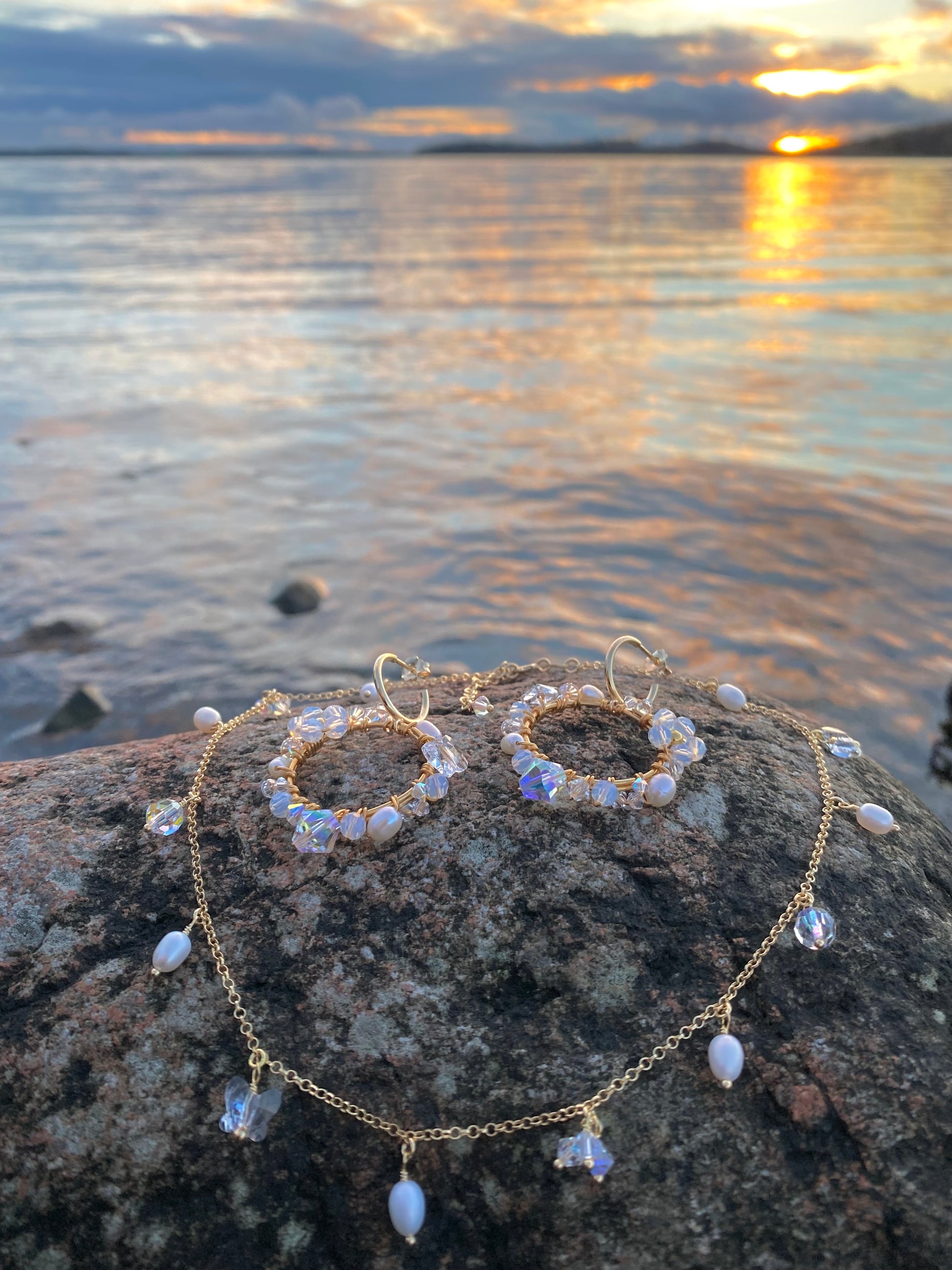 Setti sisältää korvakorut ja kaulakorun. Yhdessä käytettynä kehut ovat taattu!
