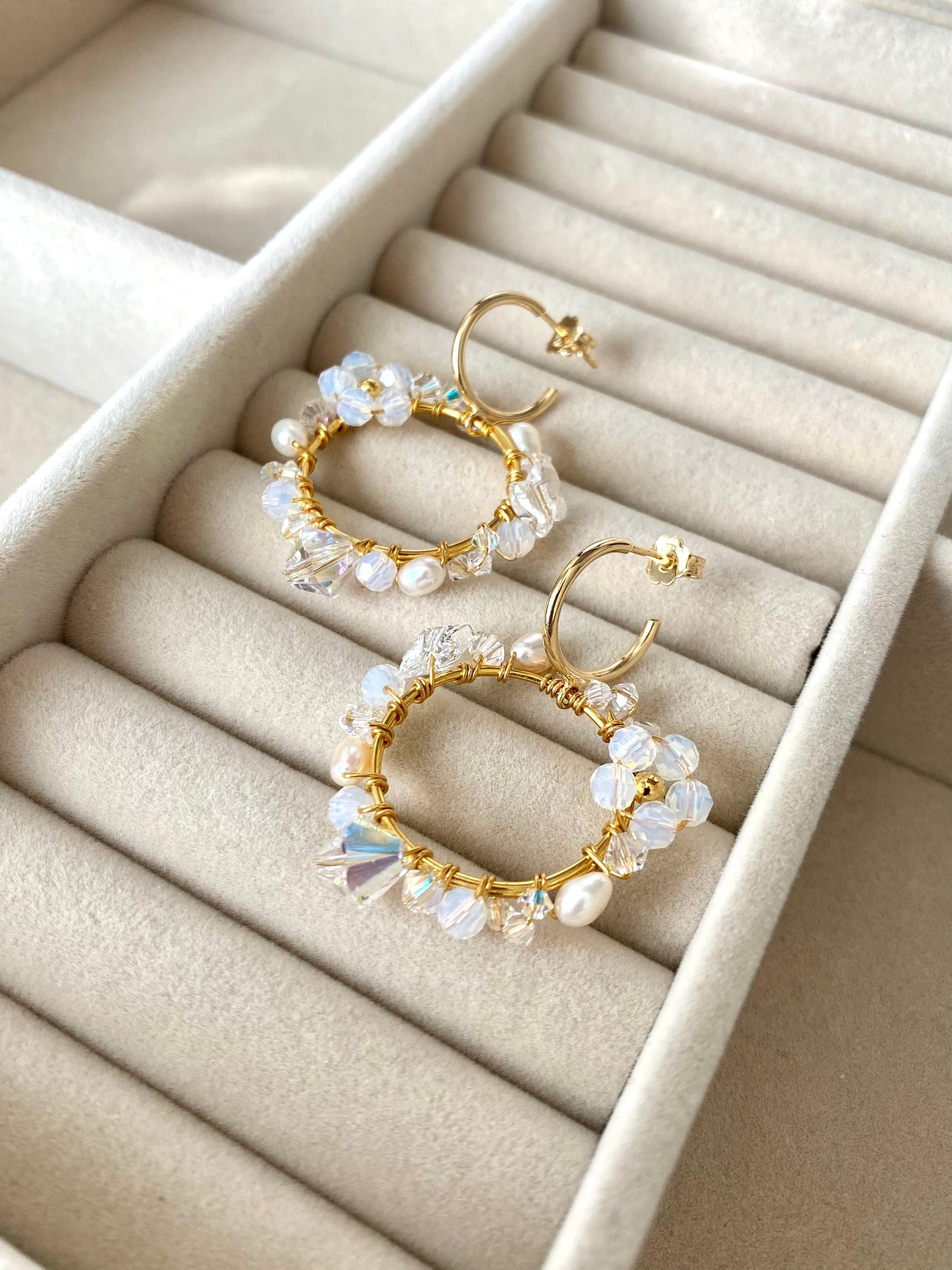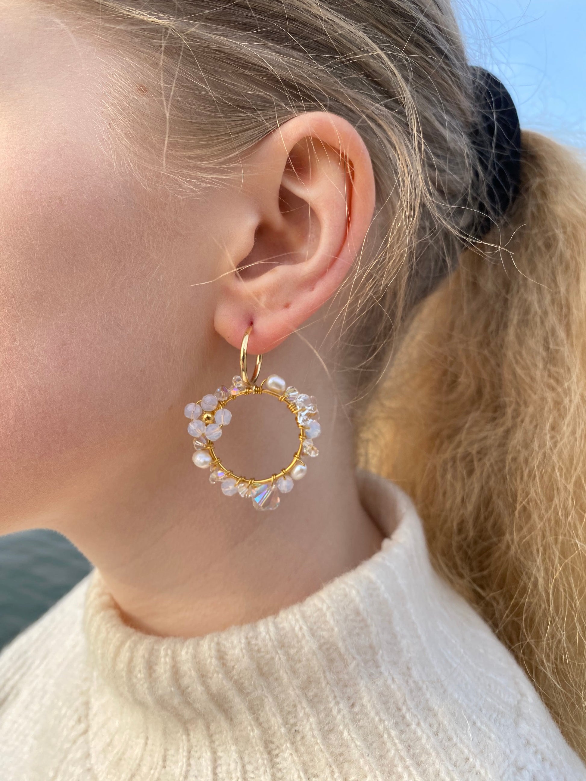 Katseita kääntävät Keskikesä-korvakorut vievät sydämesi lisäksi myös ohikulkijoiden sydämet. Korvakorurenkaat ovat 18K kullattua 925 sterling hopeaa ja riipusrengas on käsin muotoiltu 24K kullatusta kuparilangasta. Korvisrenkaiden halkaisija on 15 mm ja riipuksen 25 mm. Helmet ovat sekoitus erilaisia kristallilasihelmiä ja makeanvedenhelmiä. Jokainen on käsin kierretty renkaisiin yksi kerrallaan.