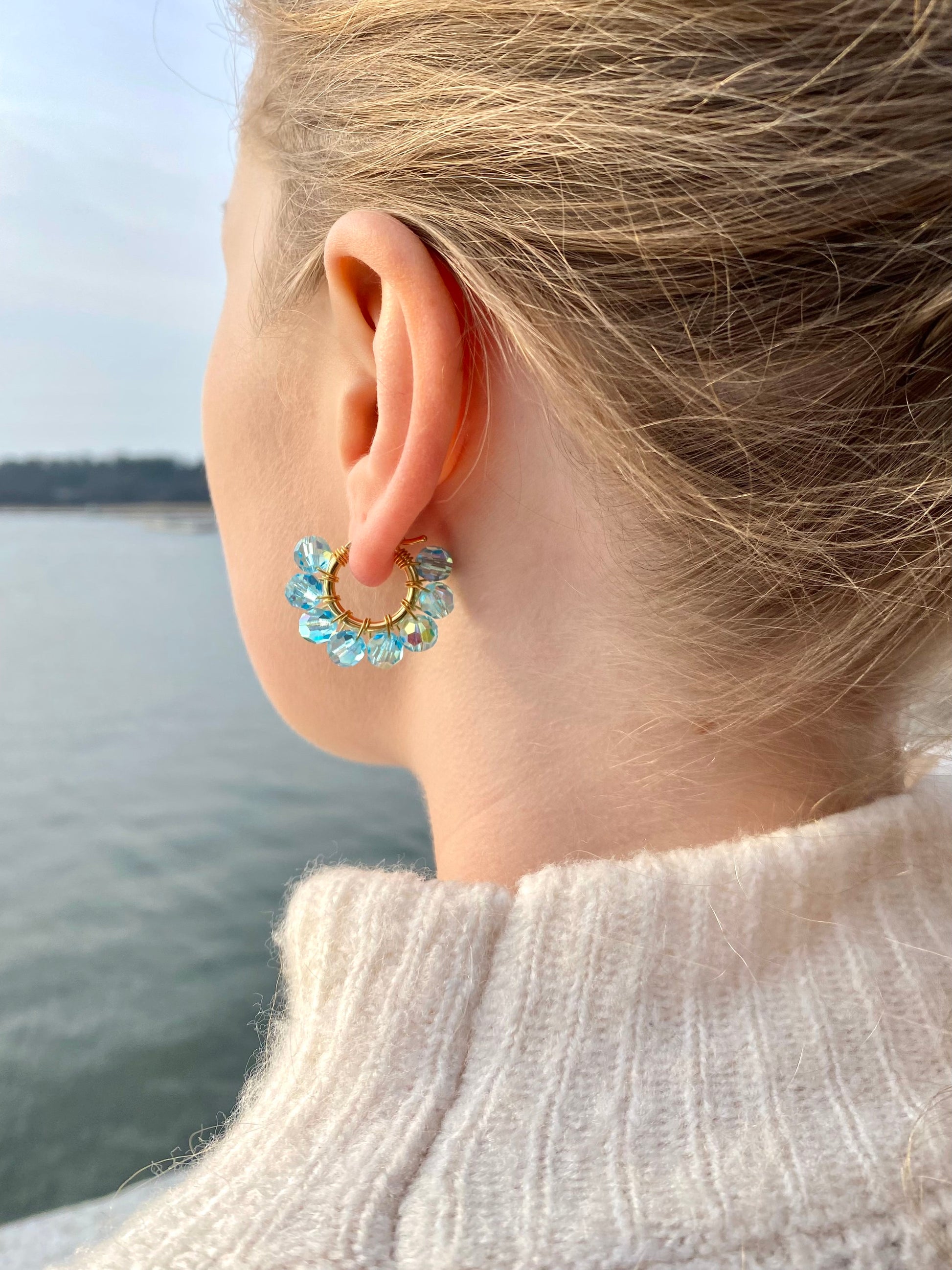Pyöreillä kristallilasihelmillä koristellut Pikkurenkaat ovat yksinkertaiset, mutta näyttävät. Halkaisijaltaan 15 mm korvakorurenkaissa suuret helmet pääsevät oikeuksiinsa. Korvakorurenkaat ovat 14K keltakullalla pinnoitettua 925 sterling hopeaa, mihin jokainen helmi on käsin punottu yksi kerrallaan. Renkaat ovat käsitelty suojakerroksella, joka ehkäisee pinnoitteen kulumista ja parantaa korun kestävyyttä.