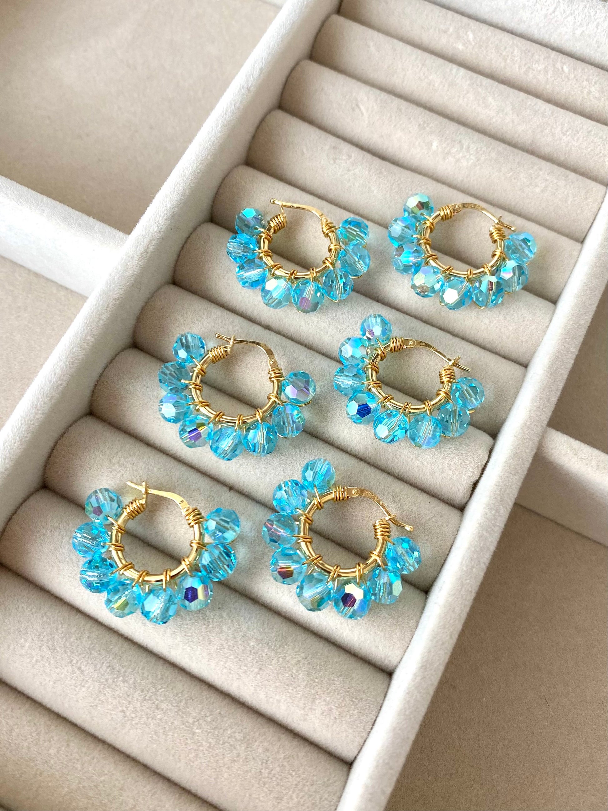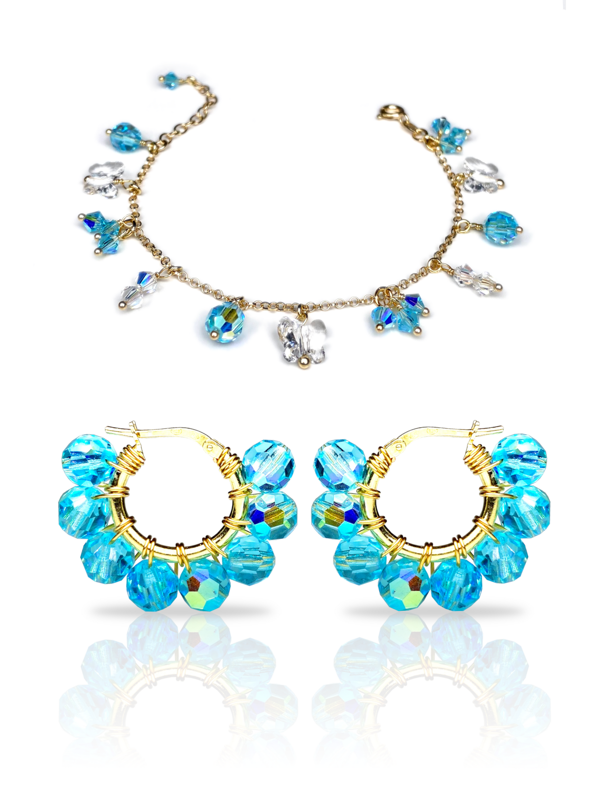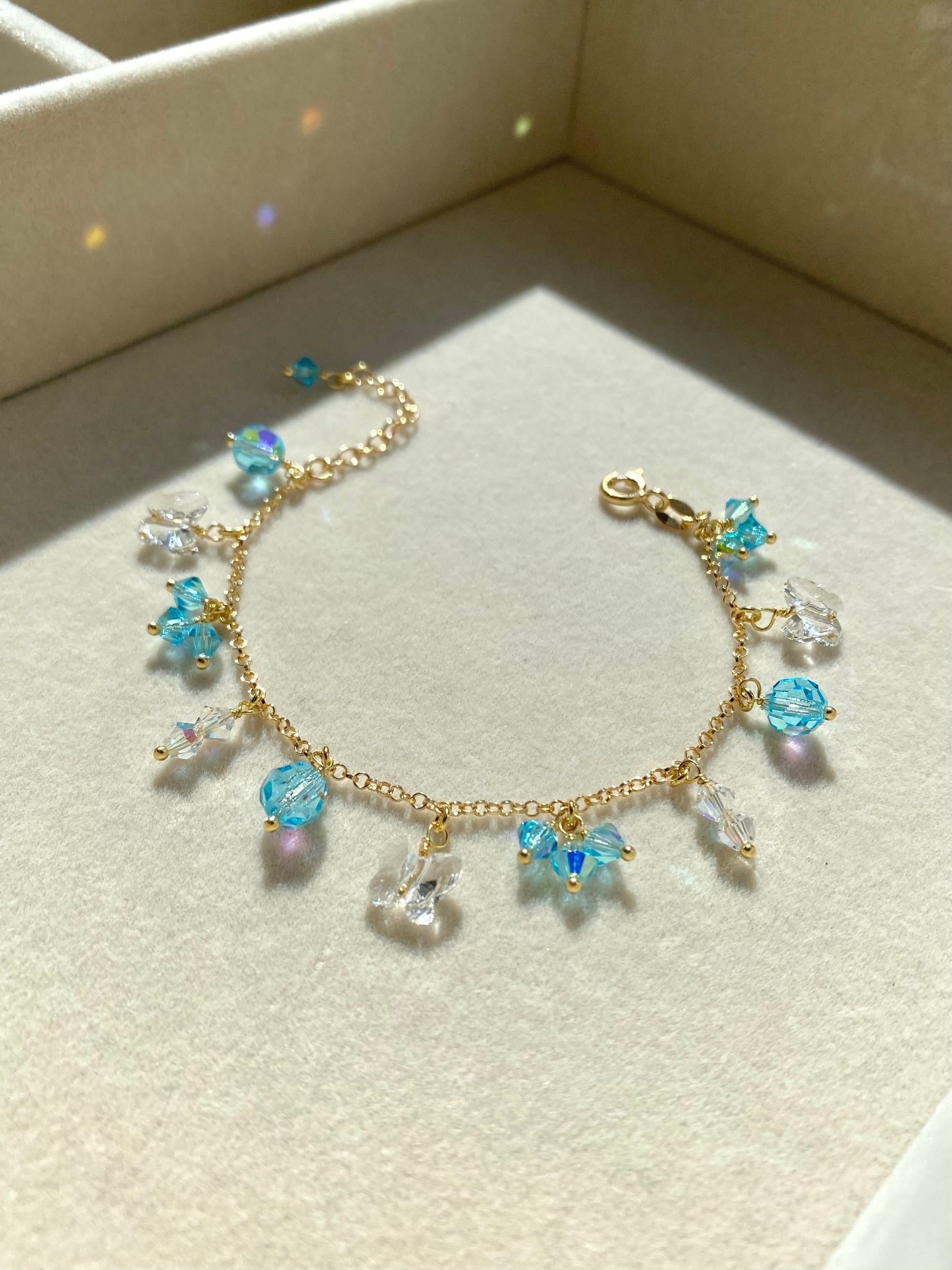 Materiaalit: 14K & 18K kullattu 925 sterling hopea, 24K kullattu kuparilanka, kristallilasihelmet ja -riipukset.