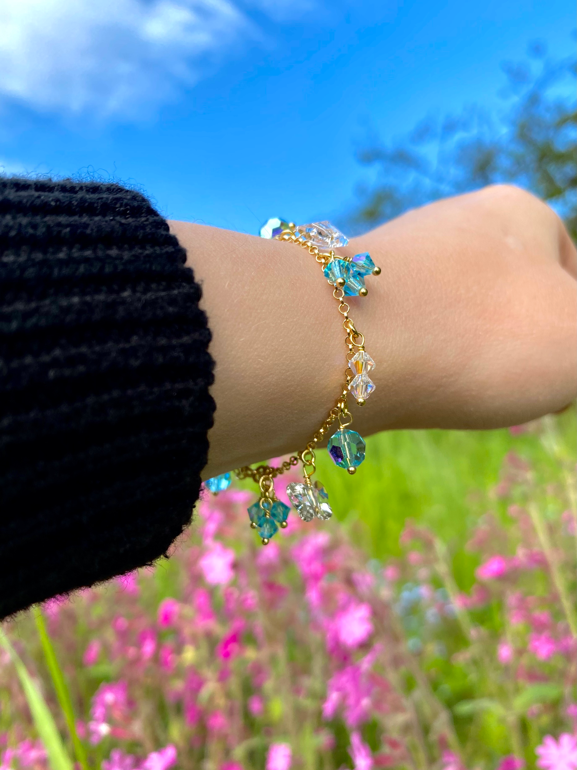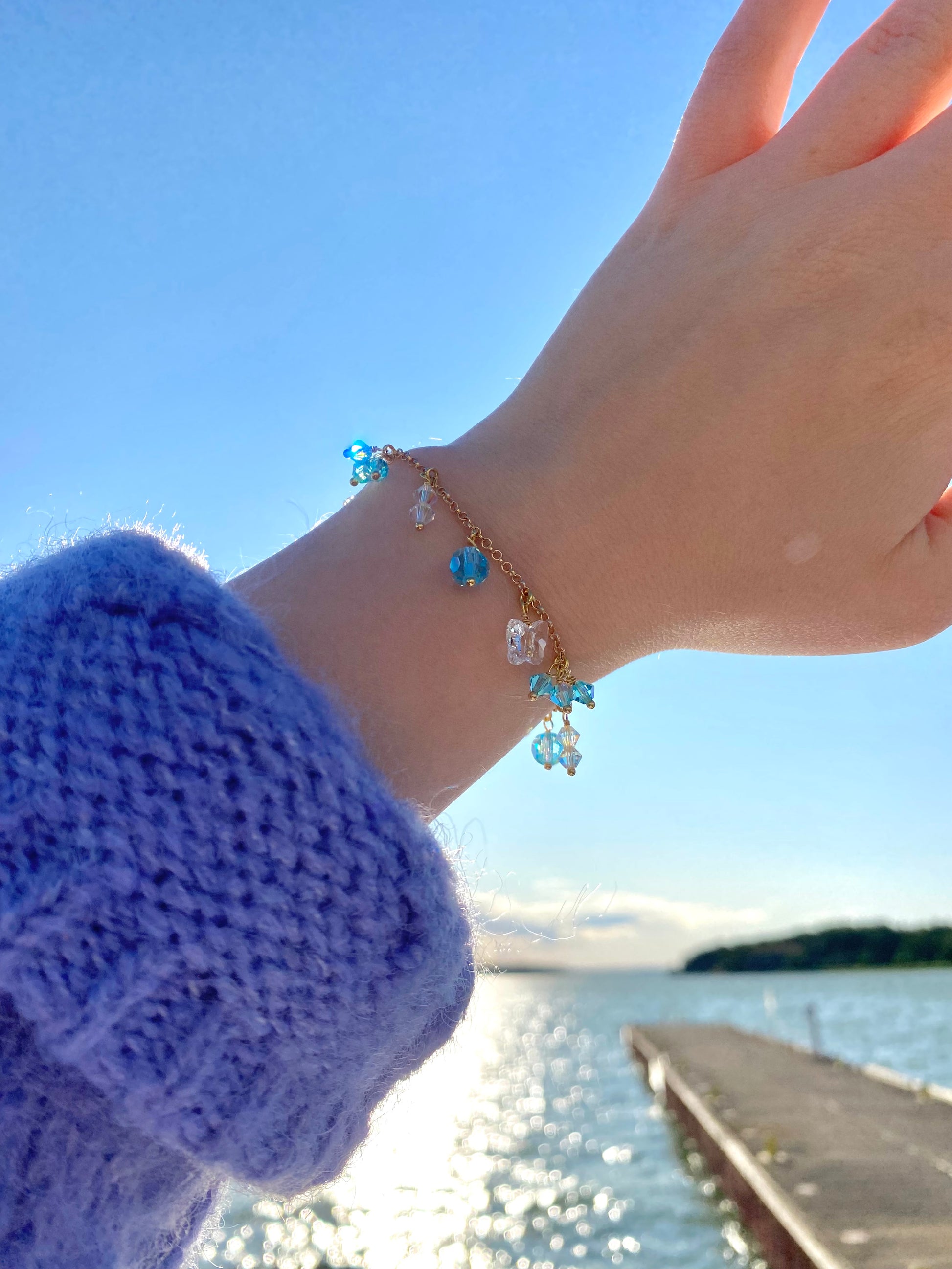 Siro, söpö ja suloinen Keidas-rannekoru on Pikkurenkaille täydellinen pari. Ohut ketju tekee korusta siron, mutta värikkäät kristallilasiriipukset saavat sen kääntämään katseita. Ketju ja muut metalliosat ovat 18K keltakullalla pinnoitettua 925 hopeaa. Ketjun pituus on 15 cm + 3 cm säätövara. Kaikki riipukset ovat käsin kiinnitetty yksi kerrallaan.