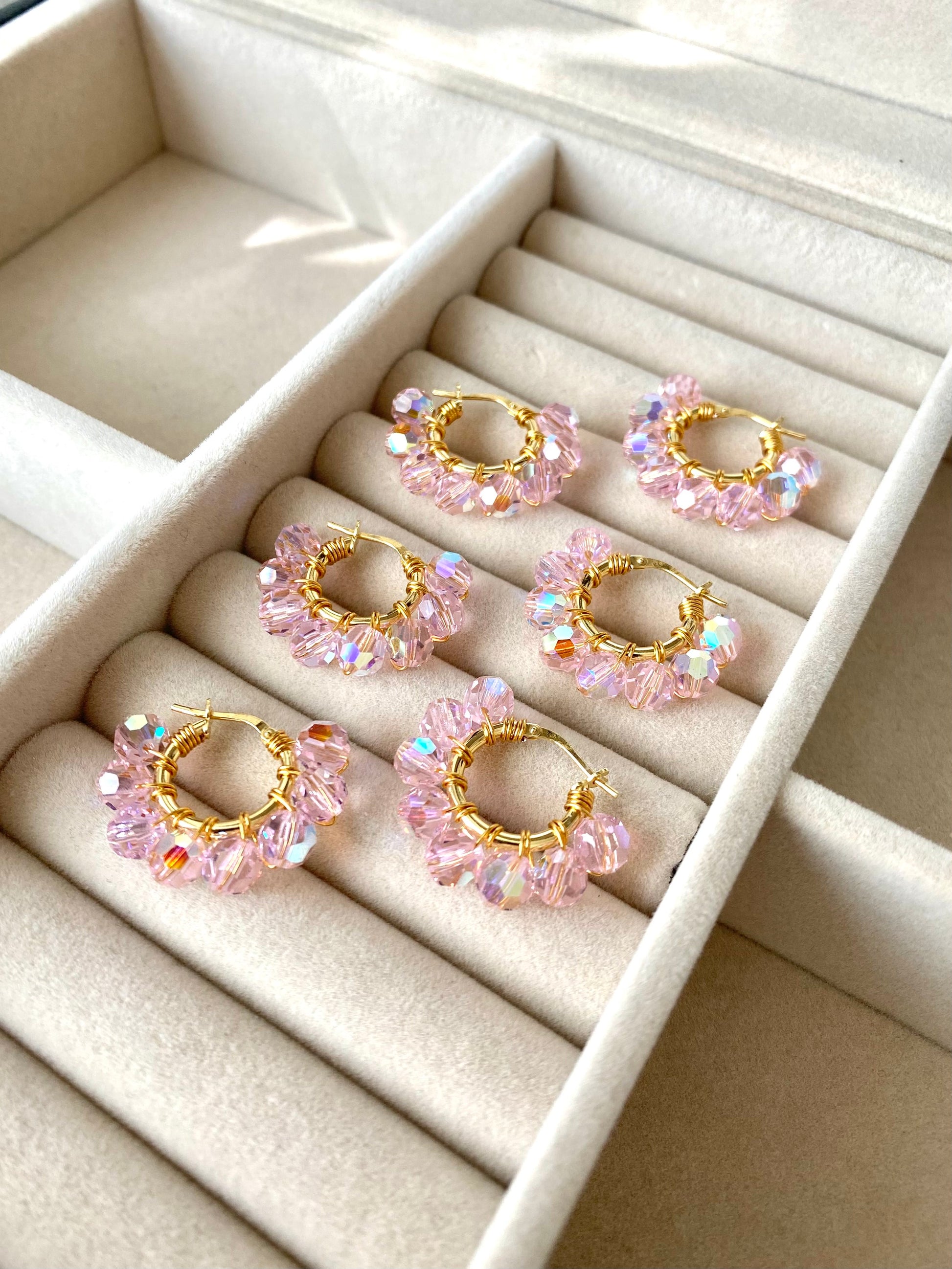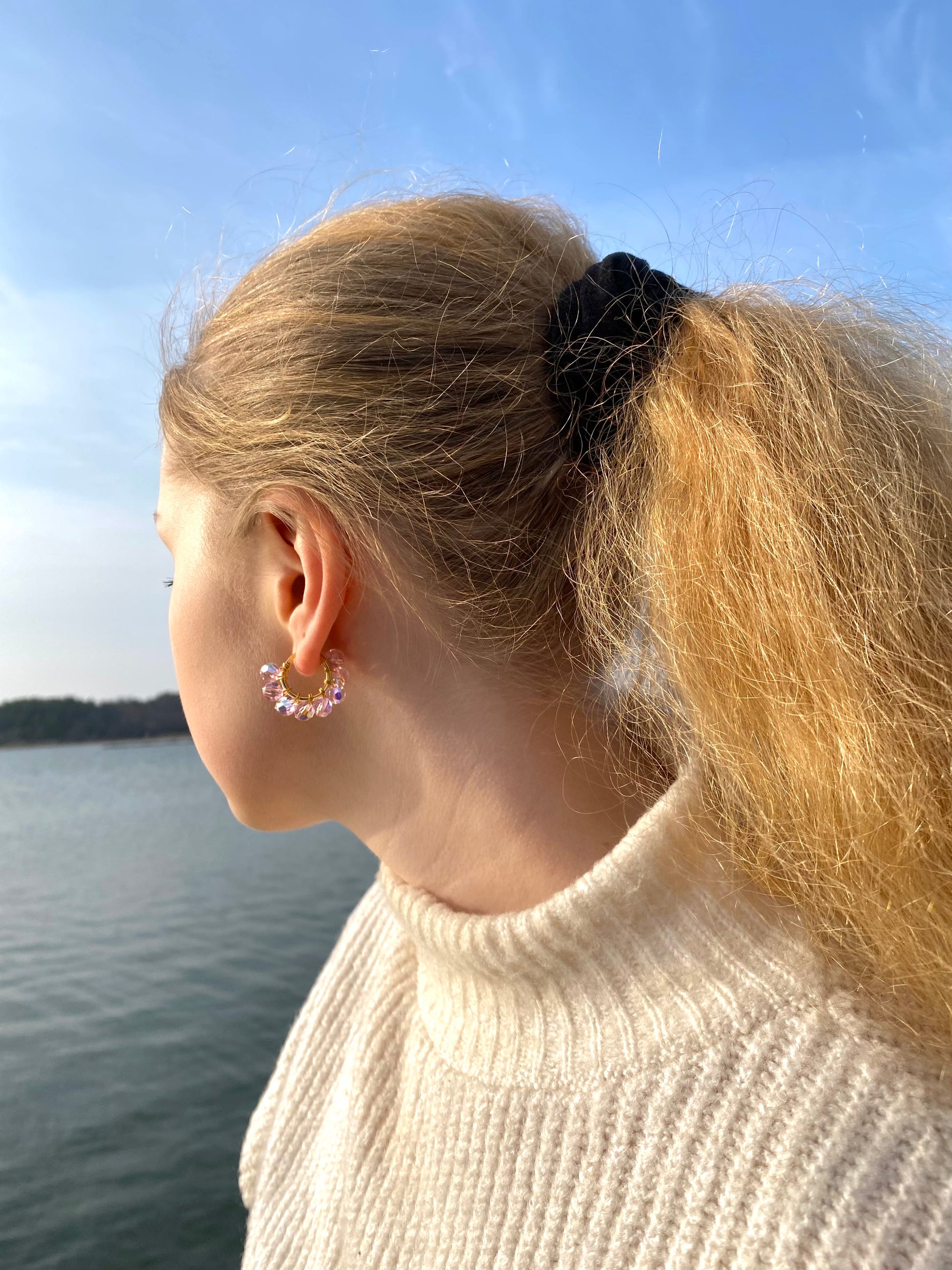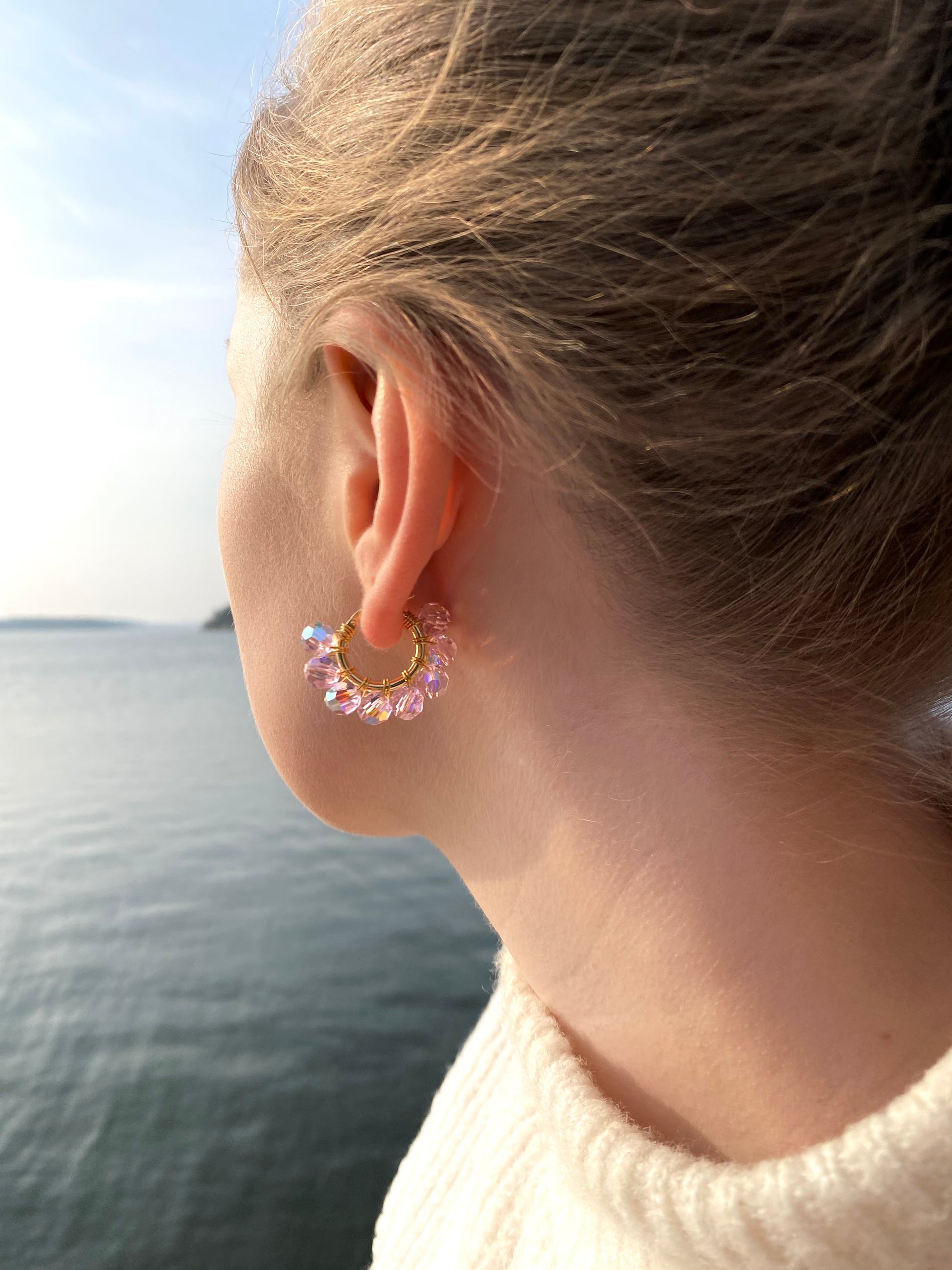 Pyöreillä kristallilasihelmillä koristellut Pikkurenkaat ovat yksinkertaiset, mutta näyttävät. Halkaisijaltaan 15 mm korvakorurenkaissa suuret helmet pääsevät oikeuksiinsa. Korvakorurenkaat ovat 14K keltakullalla pinnoitettua 925 sterling hopeaa, mihin jokainen helmi on käsin punottu yksi kerrallaan. Renkaat ovat käsitelty suojakerroksella, joka ehkäisee pinnoitteen kulumista ja parantaa korun kestävyyttä.