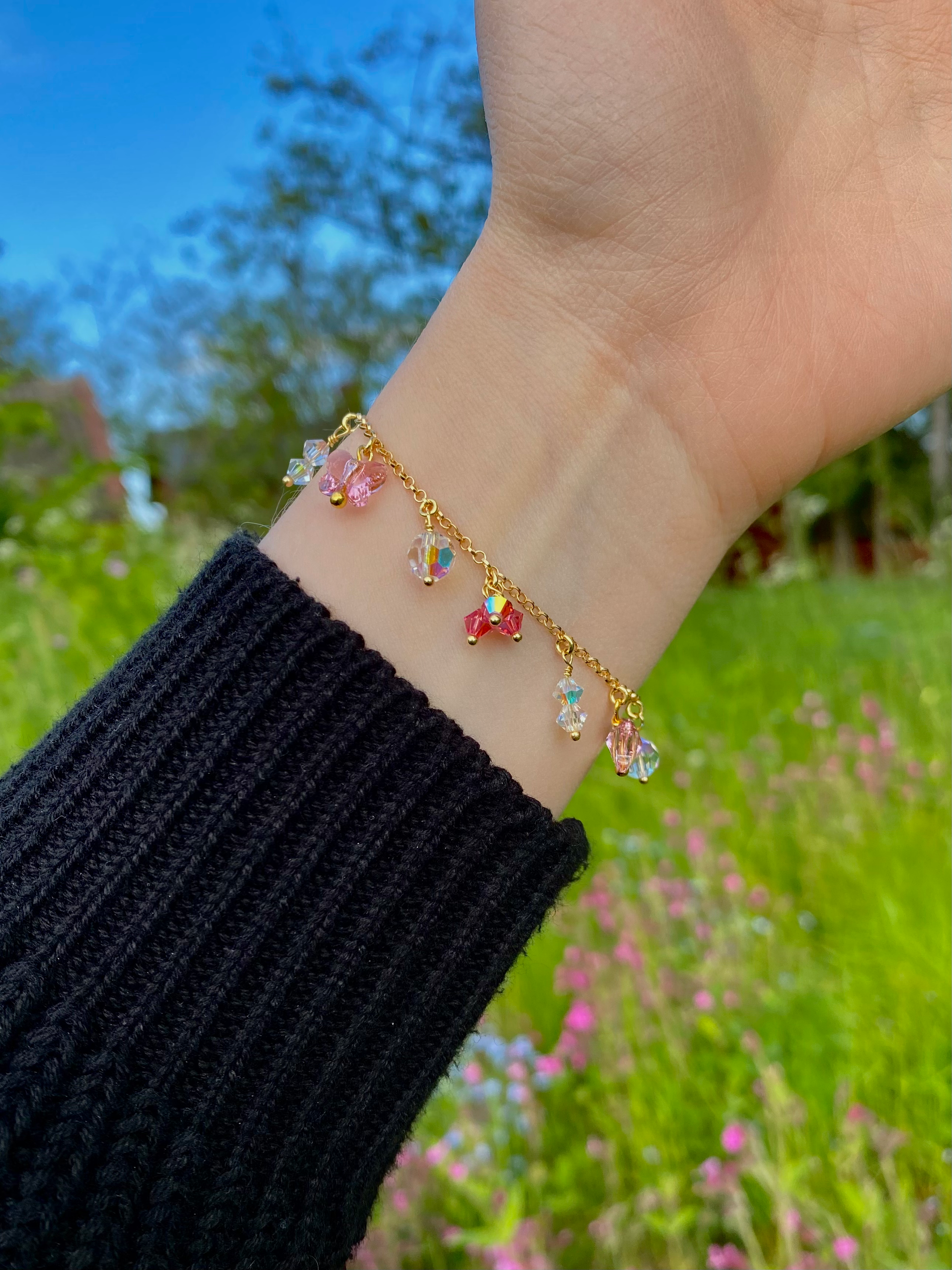 Siro, söpö ja suloinen Keidas-rannekoru on Pikkurenkaille täydellinen pari. Ohut ketju tekee korusta siron, mutta värikkäät kristallilasiriipukset saavat sen kääntämään katseita. Ketju ja muut metalliosat ovat 18K keltakullalla pinnoitettua 925 hopeaa. Ketjun pituus on 15 cm + 3 cm säätövara. Kaikki riipukset ovat käsin kiinnitetty yksi kerrallaan.
