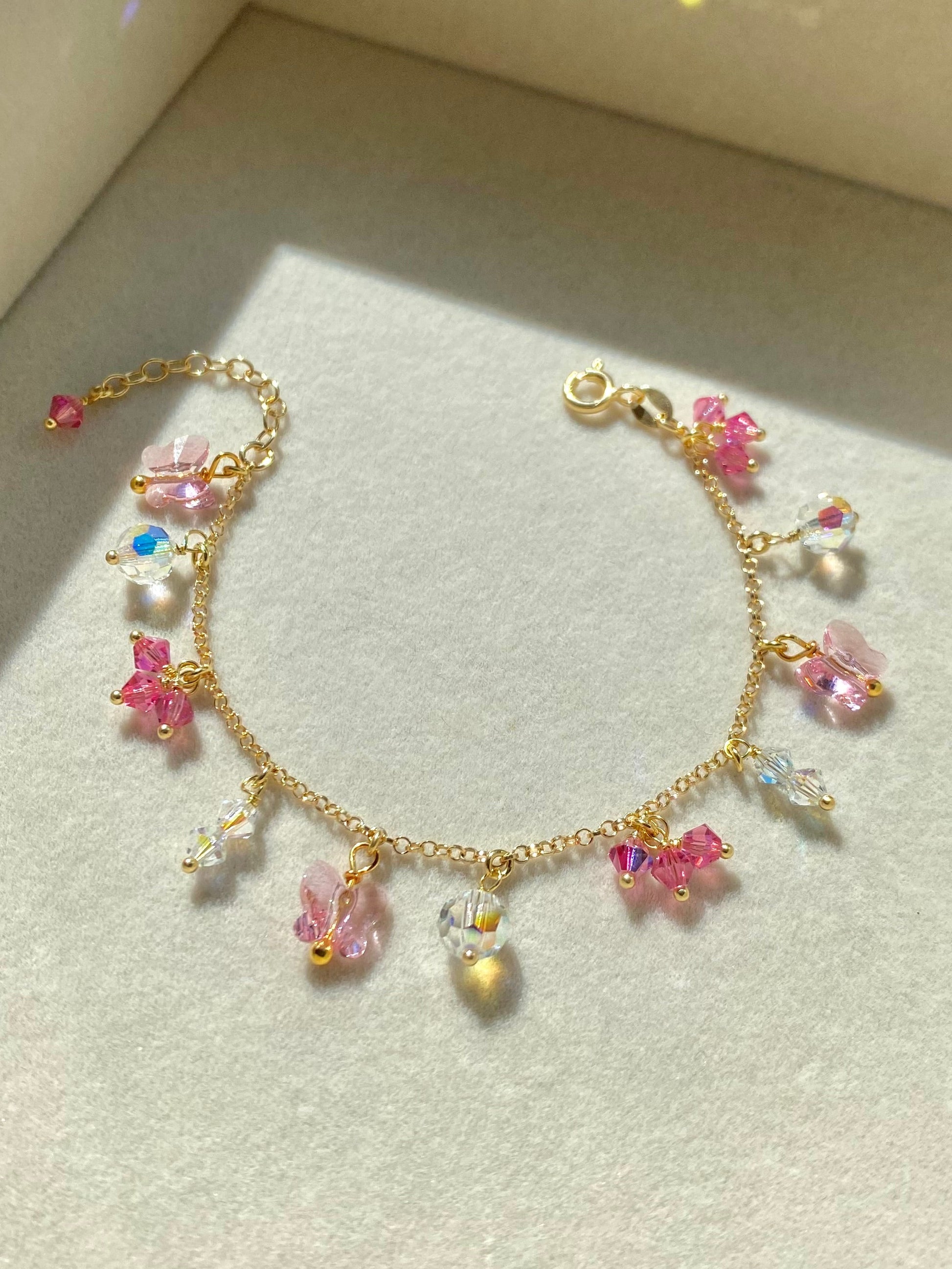 Materiaalit: 14K & 18K kullattu 925 sterling hopea, 24K kullattu kuparilanka, kristallilasihelmet ja -riipukset.