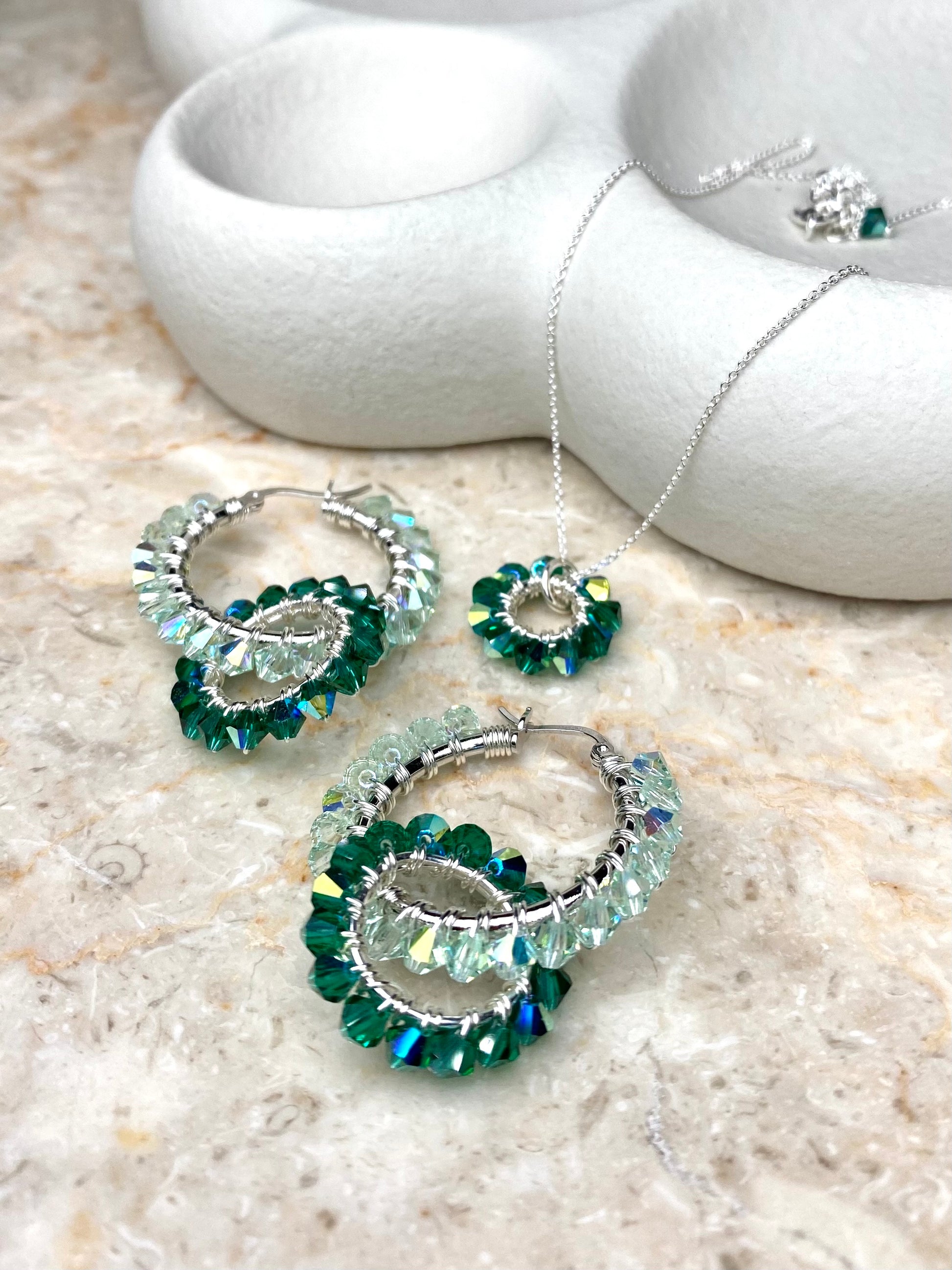 Kaulakoruketju on kierrätettyä 925 sterling hopeaa. Kristallilasihelmet ovat käsin punottu hopeoidulla kuparilangalla hopearenkaan ympärille.