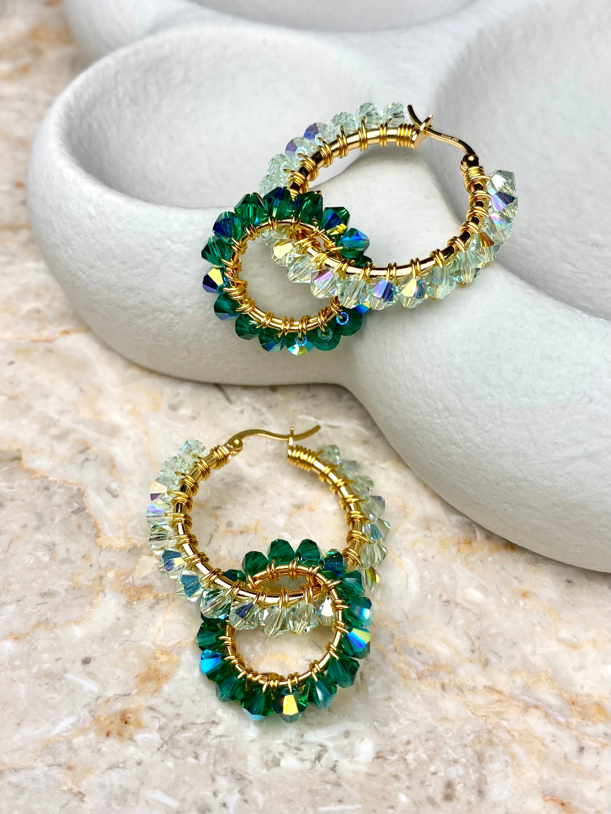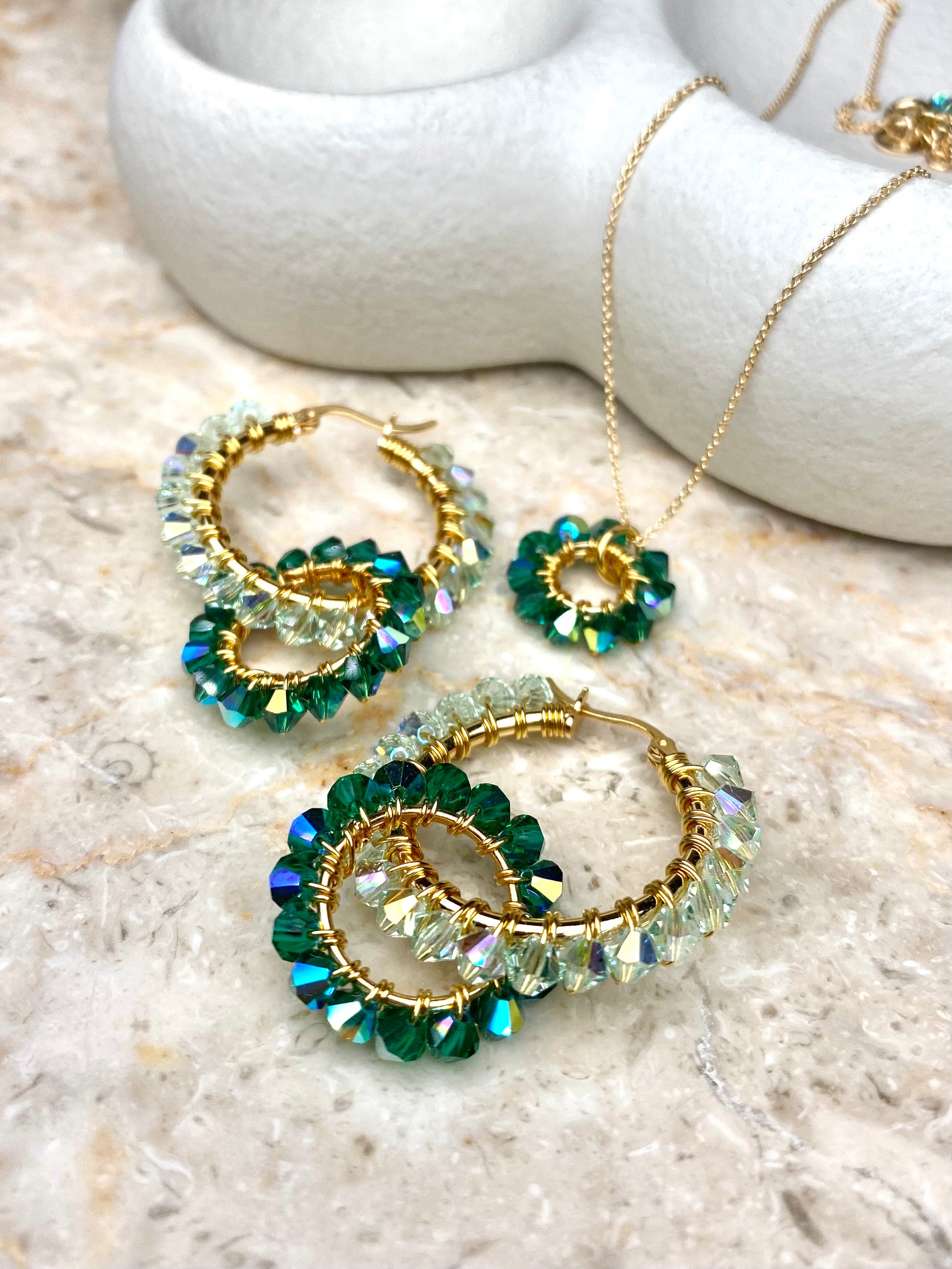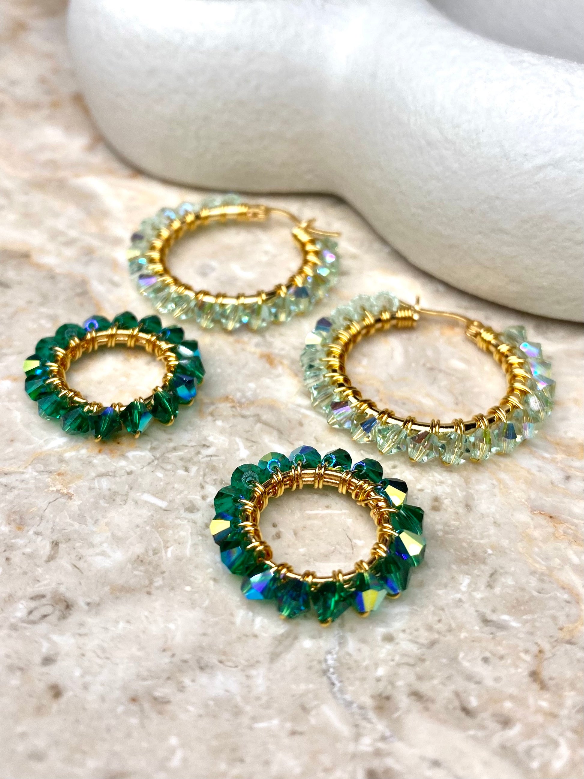 Korvakorurenkaat ovat 14K kullattua 925 sterling hopeaa. Ne on käsitelty suojakerroksella, joka ehkäisee pinnoitteen kulumista ja parantaa korun kestävyyttä. Tsekkiläiset kristallilasihelmet on punottu 24K kullatulla kuparilangalla, jolla myös riipusrengas on käsin muotoiltu.