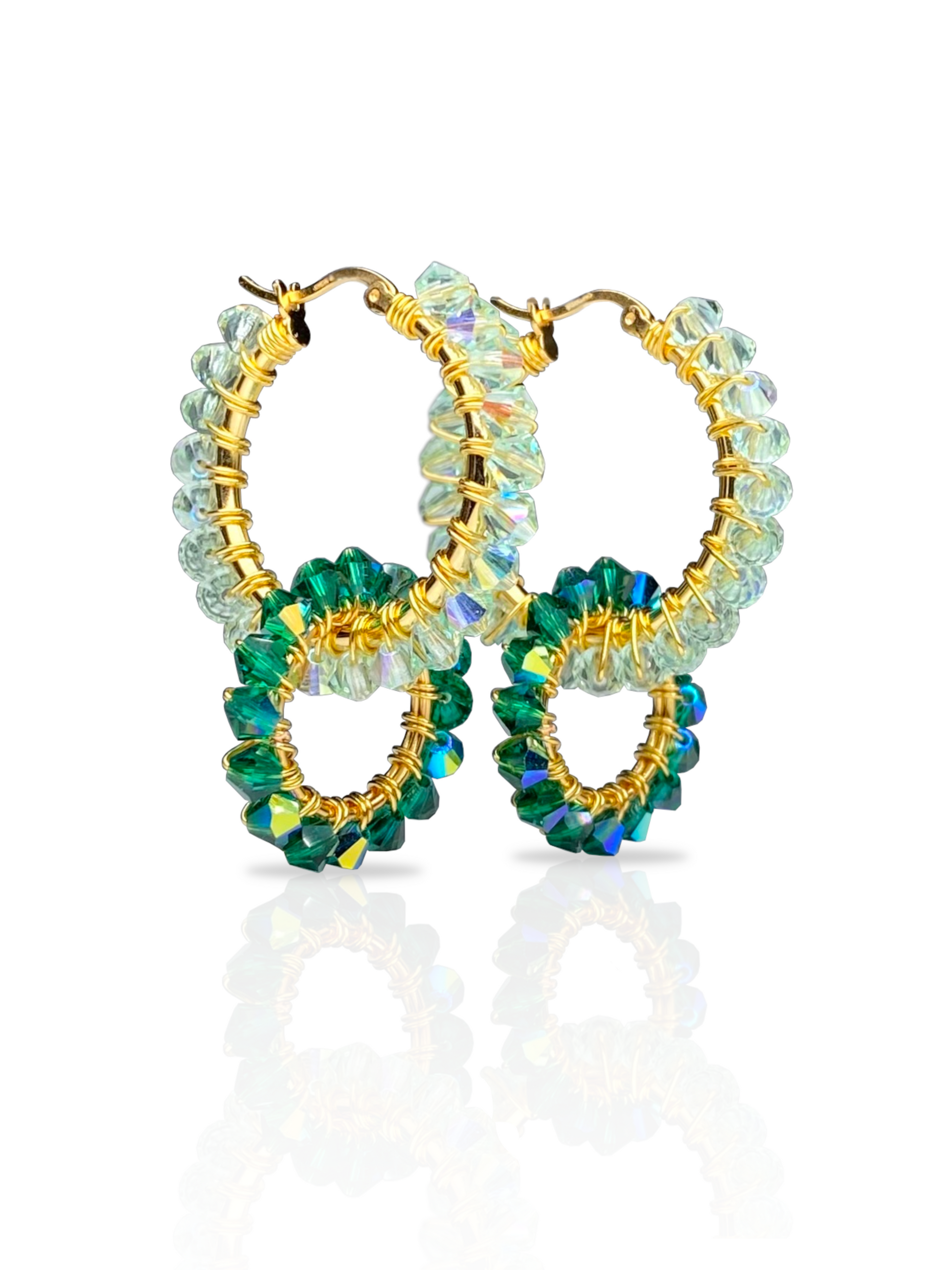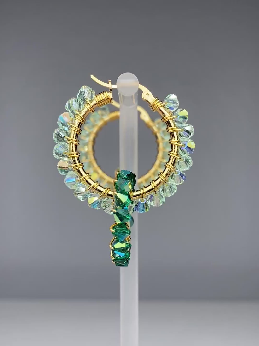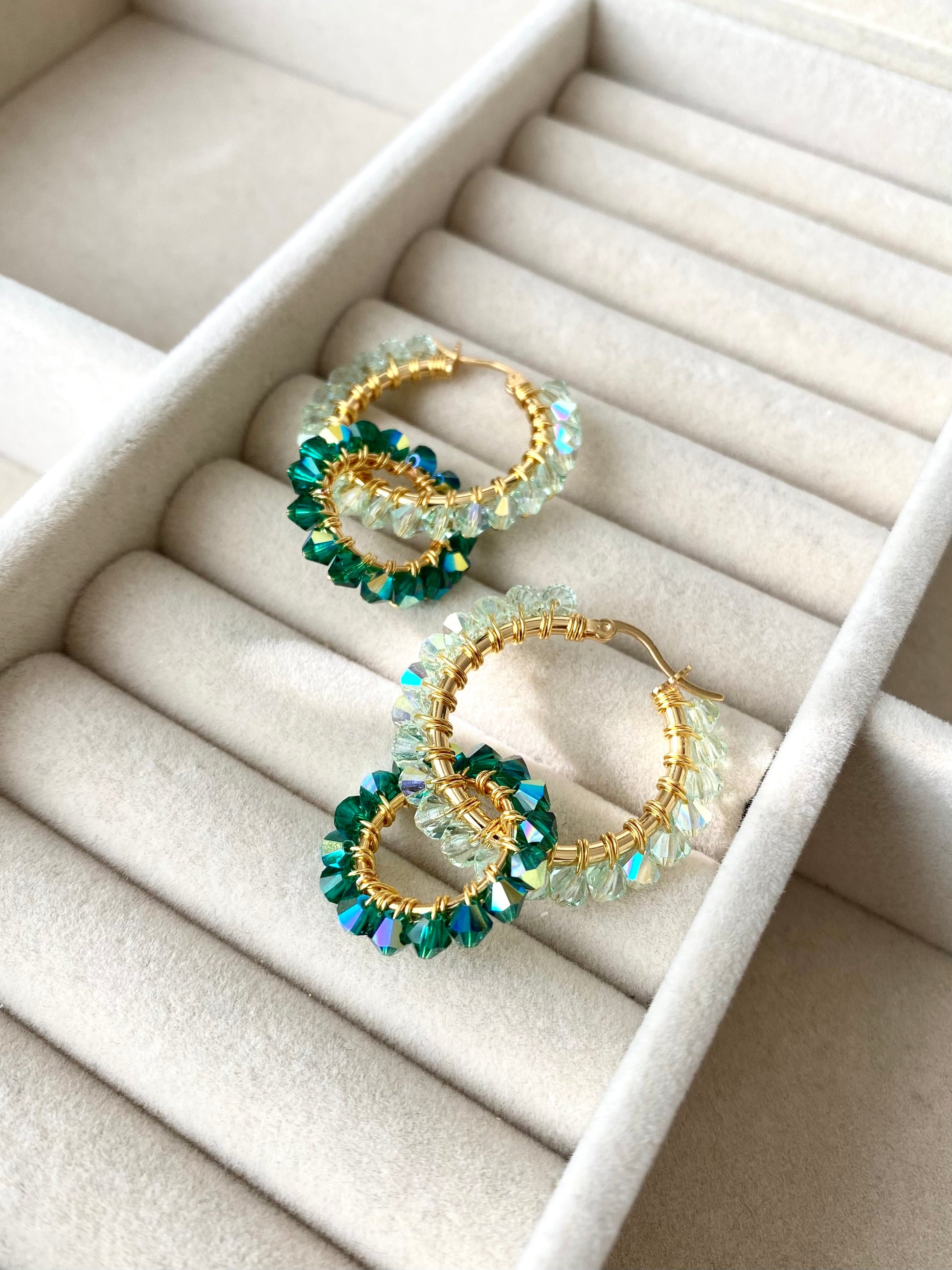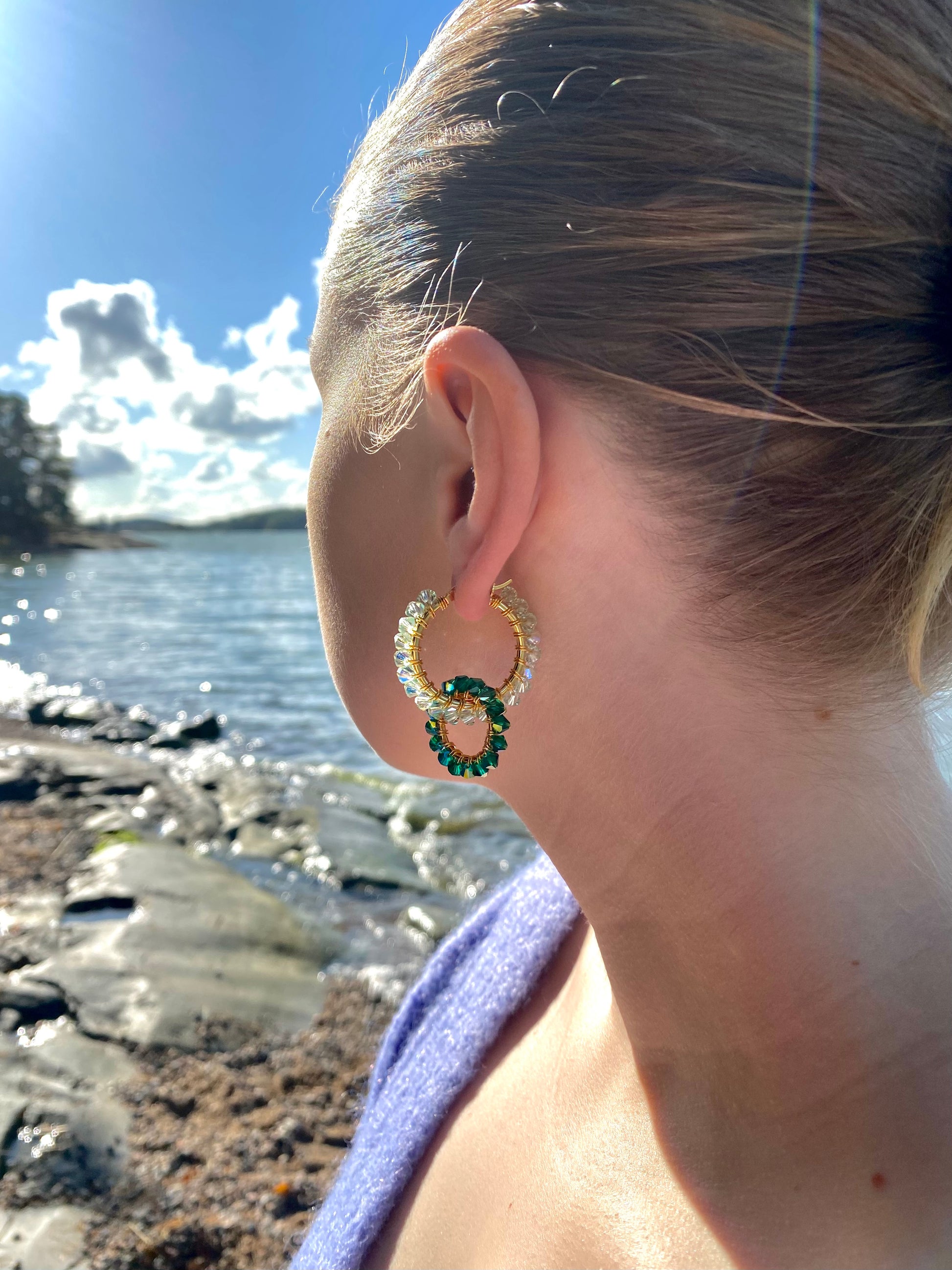 Korvakorurenkaat ovat 14K keltakullalla pinnoitettua 925 sterling hopeaa. Ne ovat käsitelty suojakerroksella, joka ehkäisee pinnoitteen kulumista ja parantaa korun kestävyyttä. Riipusrengas on käsin muotoiltu 24K kullatusta kuparilangasta ja jokainen kristallilasihelmi on niin ikään käsin kierretty riipuksen ja renkaiden ympärille yksitellen. Korvakorurenkaiden halkaisija on 25 mm ja riipuksen 14 mm. Tuplarenkaat tuovat väriä arkeen tai viimeistelevät juhla-asun täydellisesti.