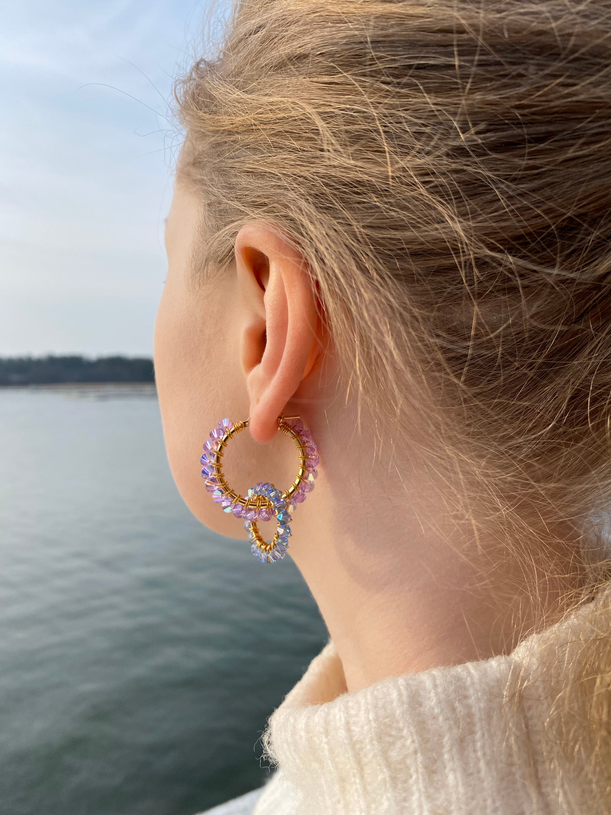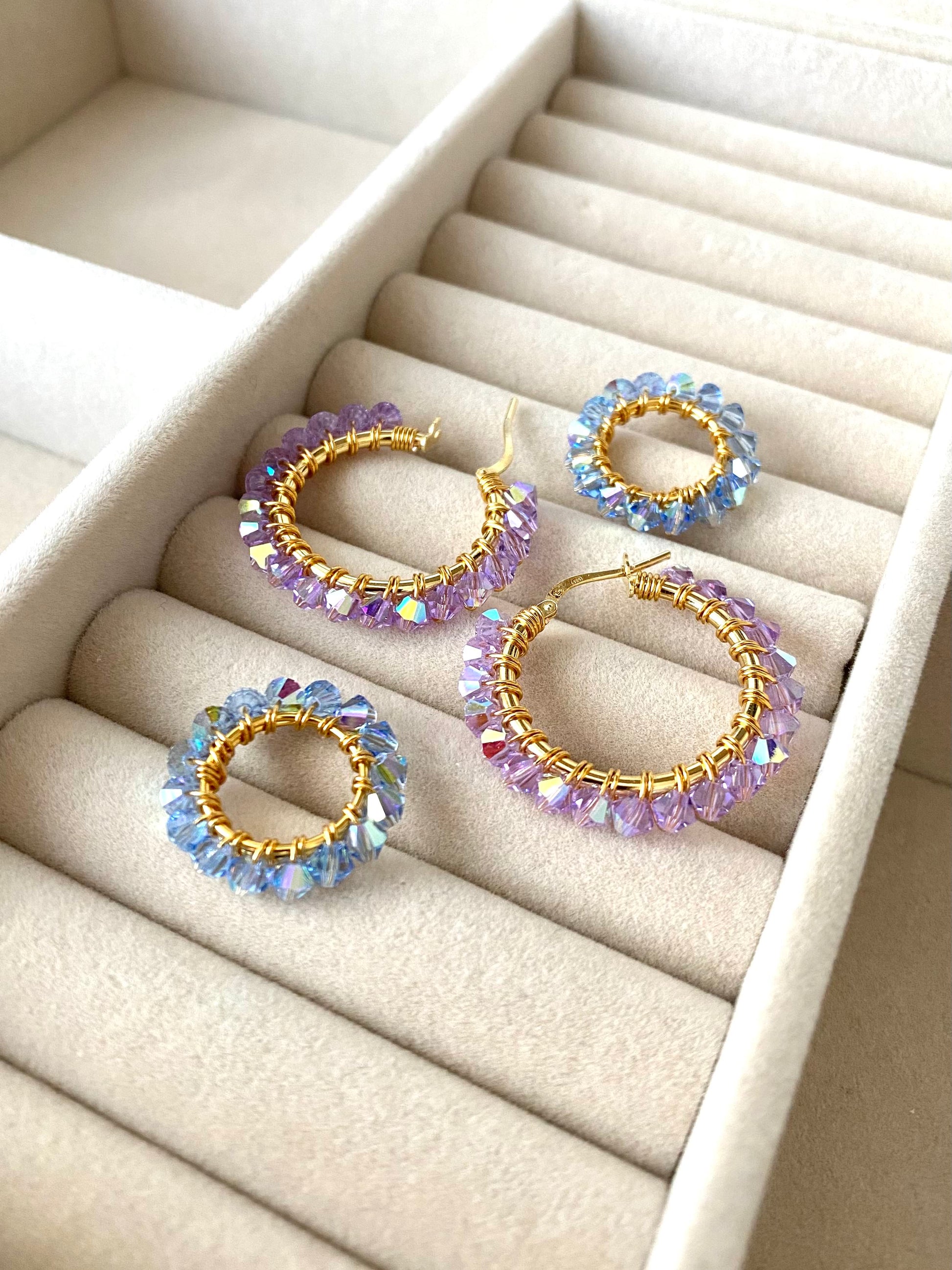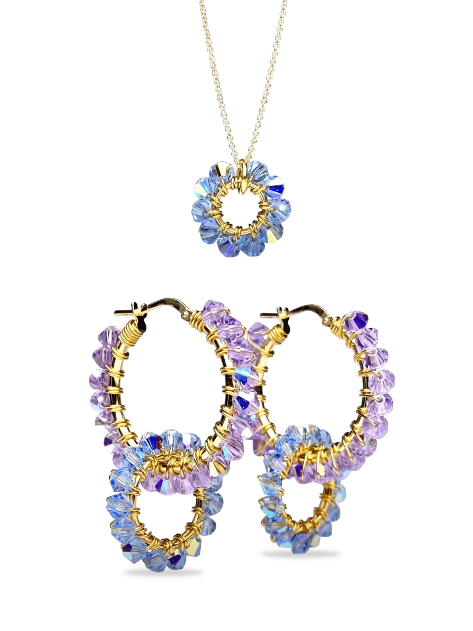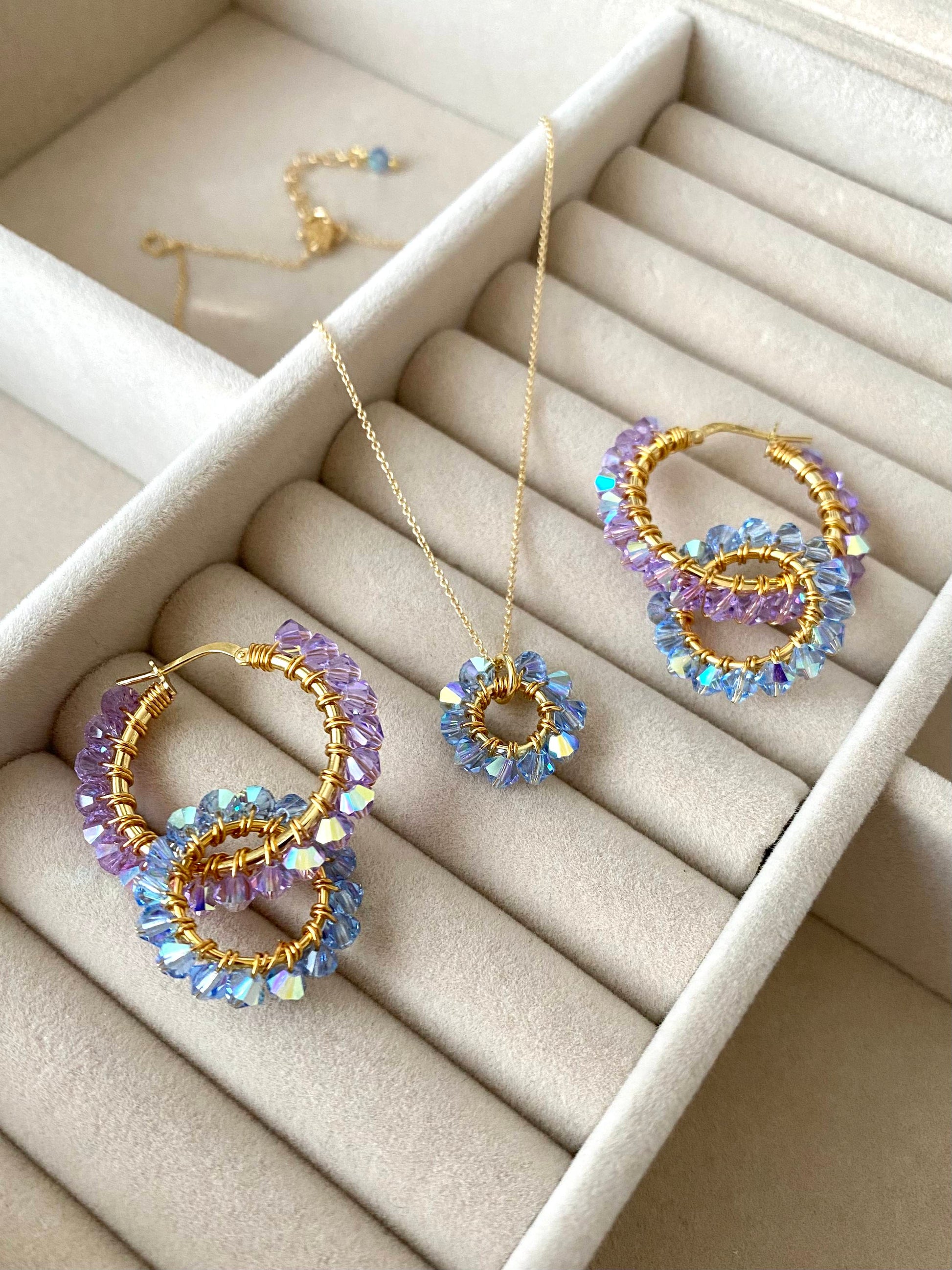 Korvakorurenkaat ovat 14K keltakullalla pinnoitettua 925 sterling hopeaa. Ne ovat käsitelty suojakerroksella, joka ehkäisee pinnoitteen kulumista ja parantaa korun kestävyyttä. Riipusrengas on käsin muotoiltu 24K kullatusta kuparilangasta ja jokainen kristallilasihelmi on niin ikään käsin kierretty riipuksen ja renkaiden ympärille yksitellen. Korvakorurenkaiden halkaisija on 25 mm ja riipuksen 14 mm.