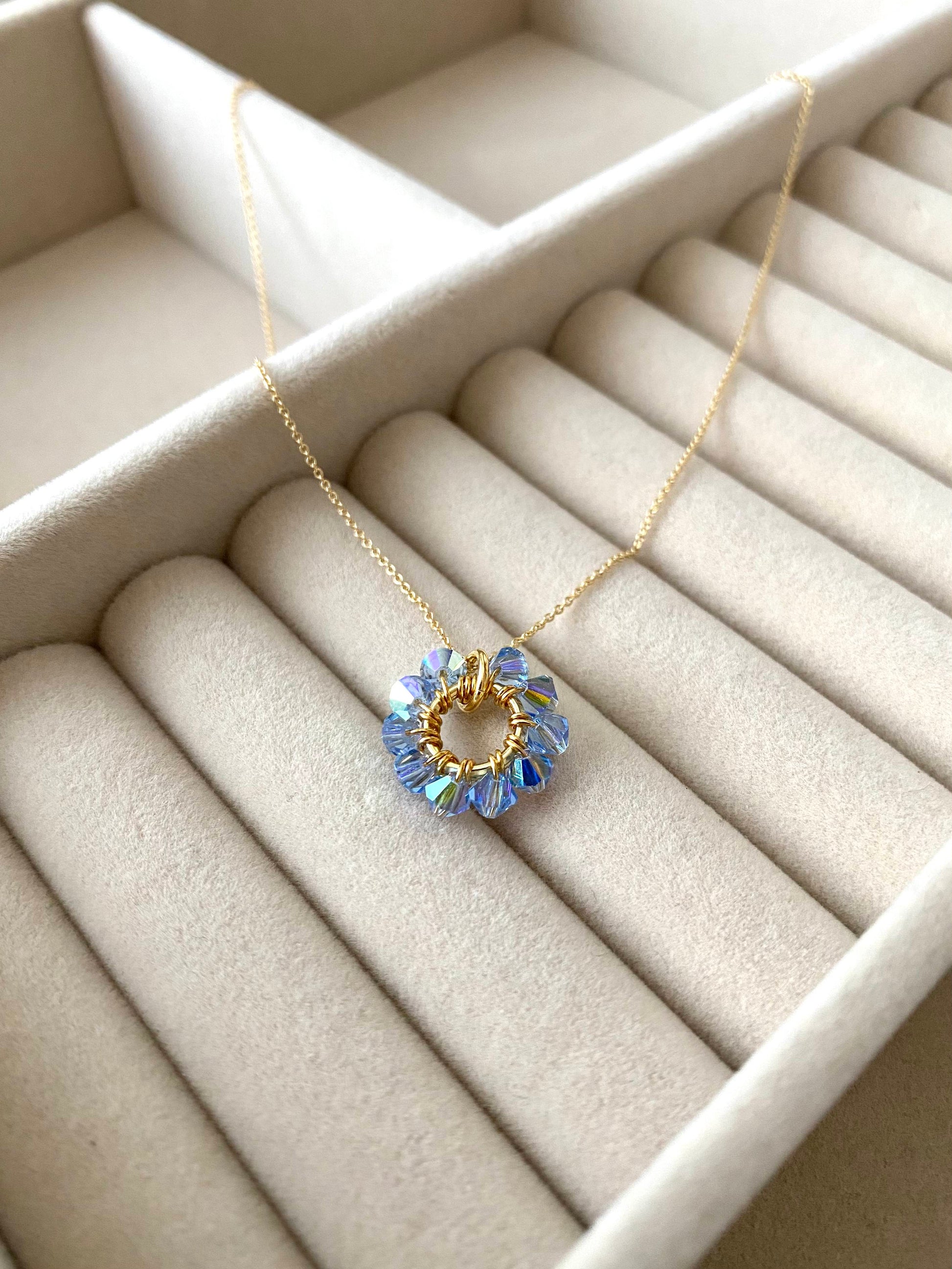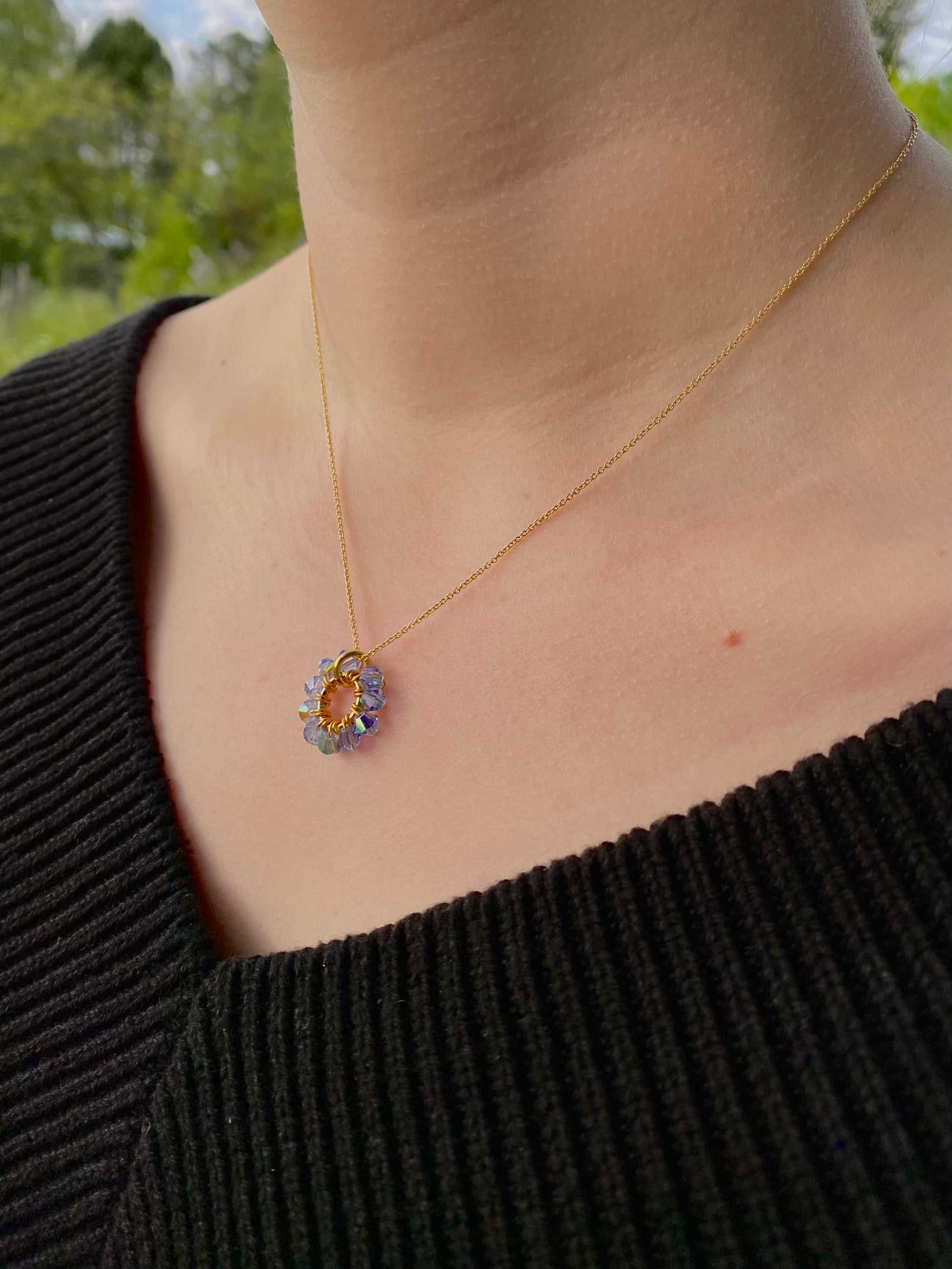 Kaulakoruketju on 18K kullattua 925 sterling hopeaa. Kristallilasihelmet ovat käsin kierretty 24K kullatulla kuparilangalla kullatun hopearenkaan ympärille. Riipusrenkaan halkaisija on 1,5 cm ja kaulakoruketjun pituus 40 cm + 3 cm säätövara.