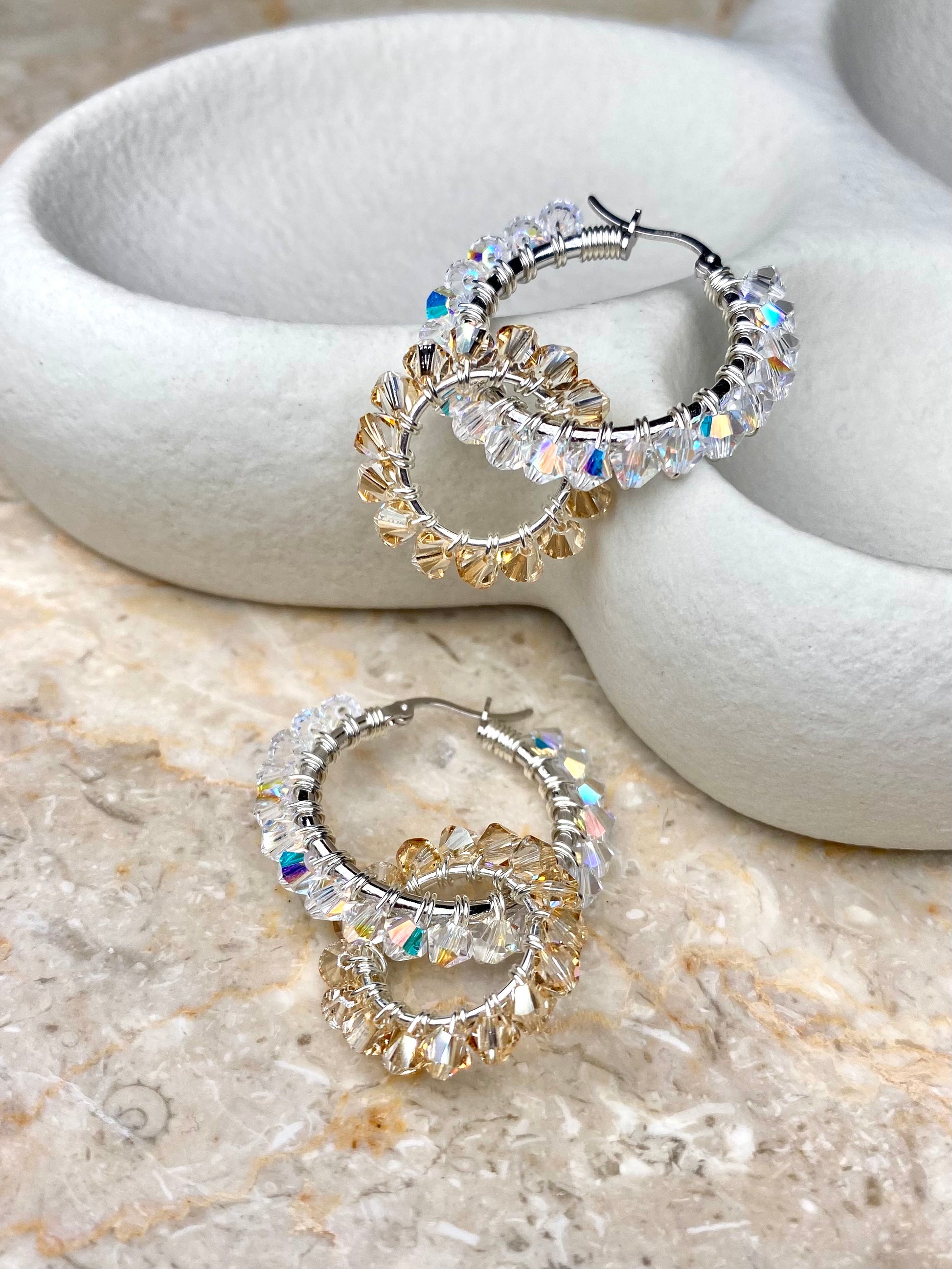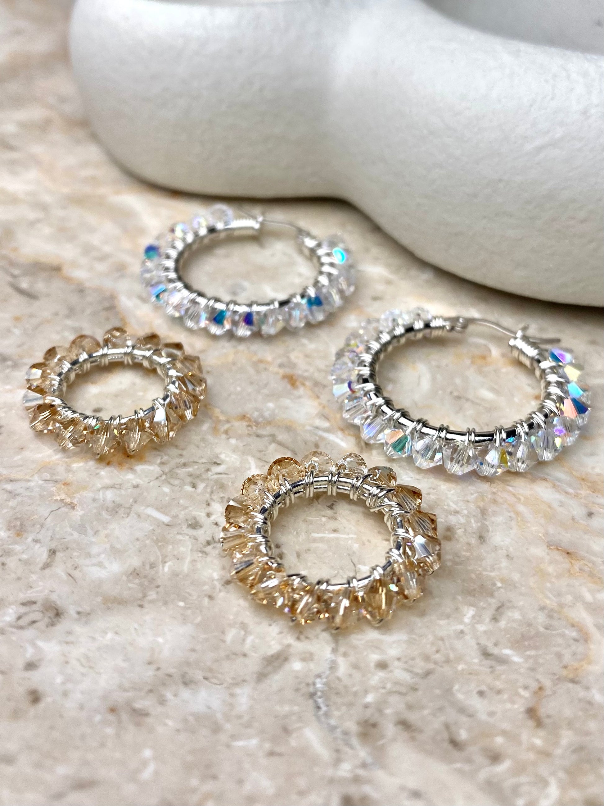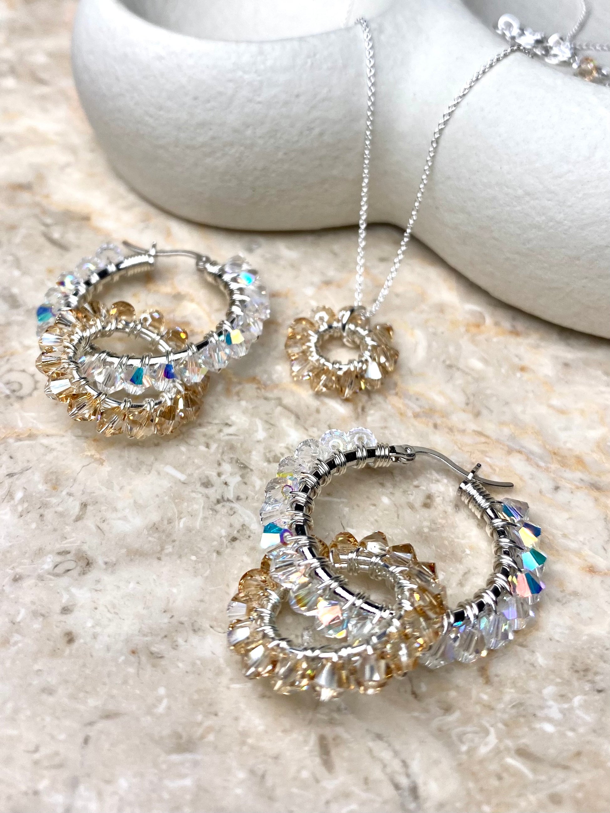 Korvakorurenkaat ovat 925 sterling hopeaa ja niissä on rodium-pinnoite, joka suojaa korun pintaa ja parantaa sen kestävyyttä. Tsekkiläiset kristallilasihelmet on punottu hopeoidulla kuparilangalla, jolla riipusrengas on myös käsin muotoiltu.