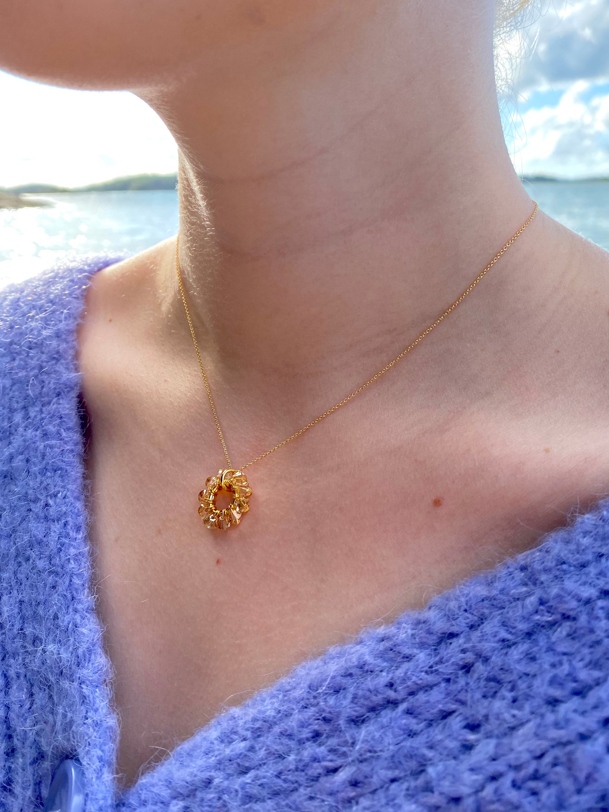Kaulakoruketju on 18K kullattua 925 sterling hopeaa. Kristallilasihelmet ovat käsin kierretty 24K kullatulla kuparilangalla kullatun hopearenkaan ympärille. Riipusrenkaan halkaisija on 1,5 cm ja kaulakoruketjun pituus 40 cm + 3 cm säätövara.