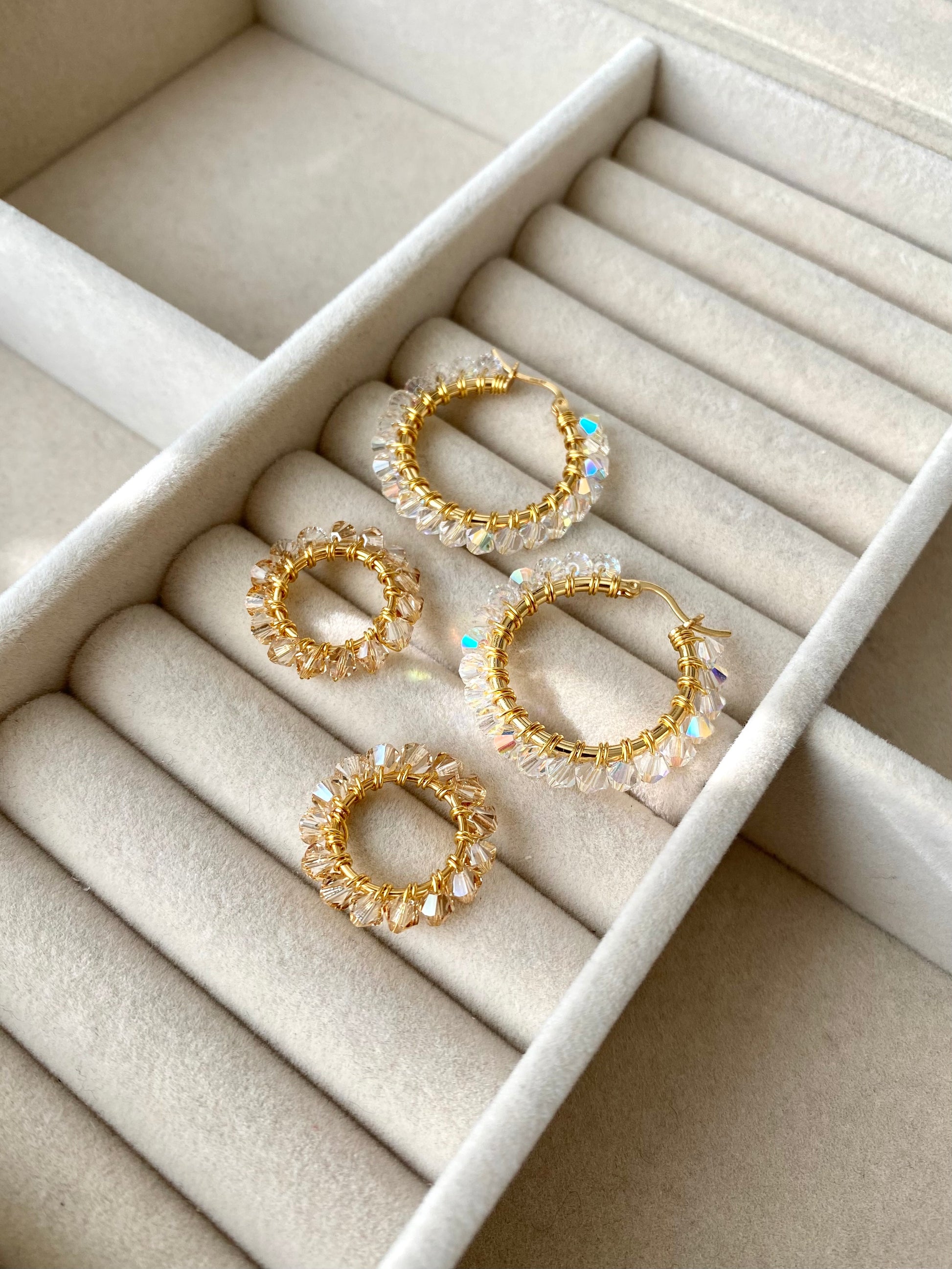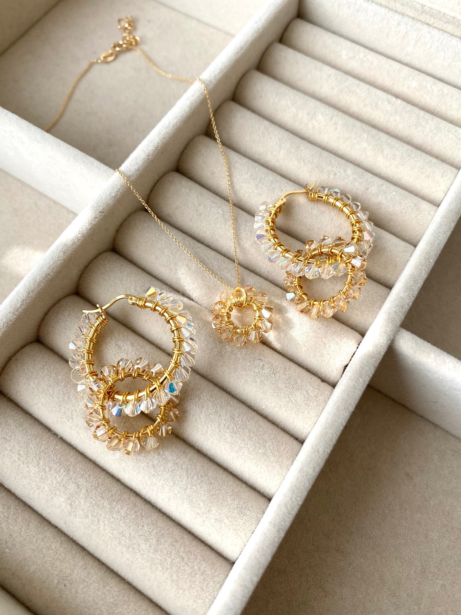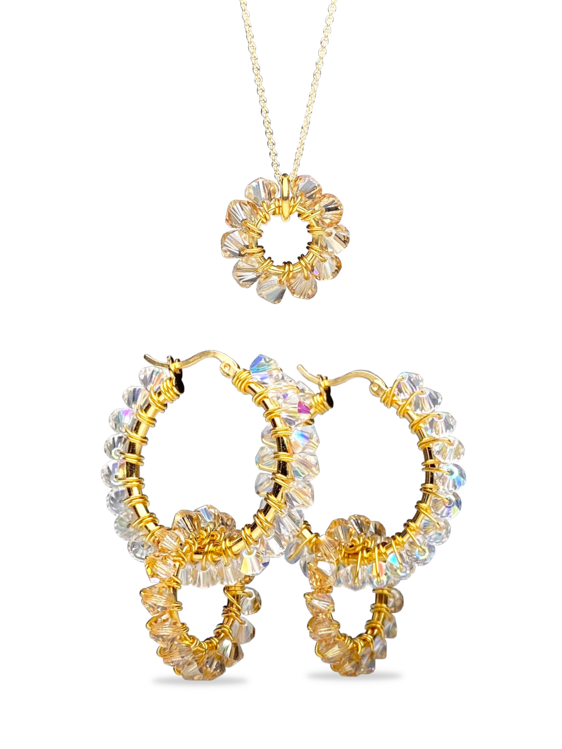 Korvakorurenkaat ovat 14K keltakullalla pinnoitettua 925 sterling hopeaa. Ne ovat käsitelty suojakerroksella, joka ehkäisee pinnoitteen kulumista ja parantaa korun kestävyyttä. Riipusrengas on käsin muotoiltu 24K kullatusta kuparilangasta ja jokainen kristallilasihelmi on niin ikään käsin kierretty riipuksen ja renkaiden ympärille yksitellen. Korvakorurenkaiden halkaisija on 25 mm ja riipuksen 14 mm.