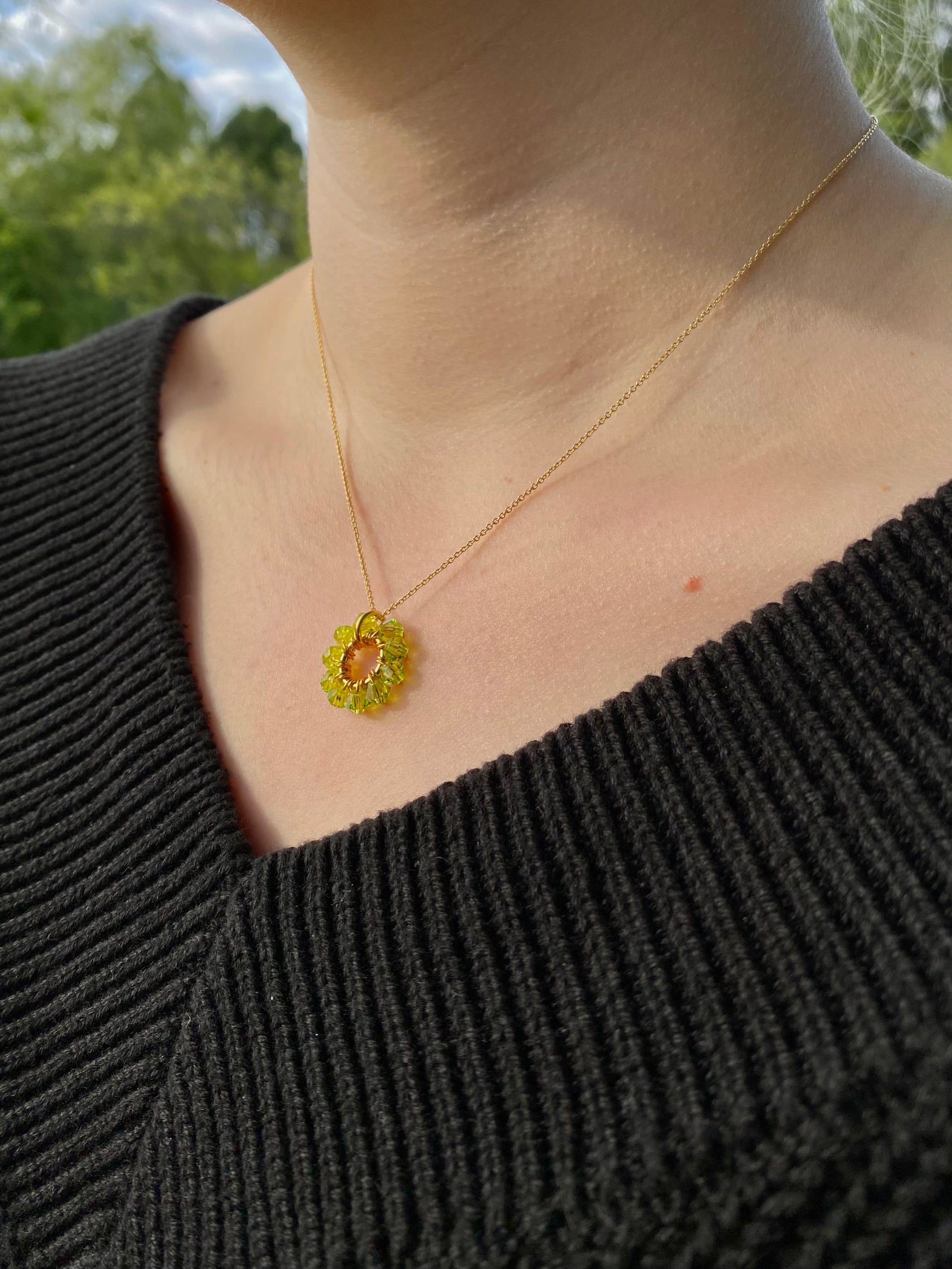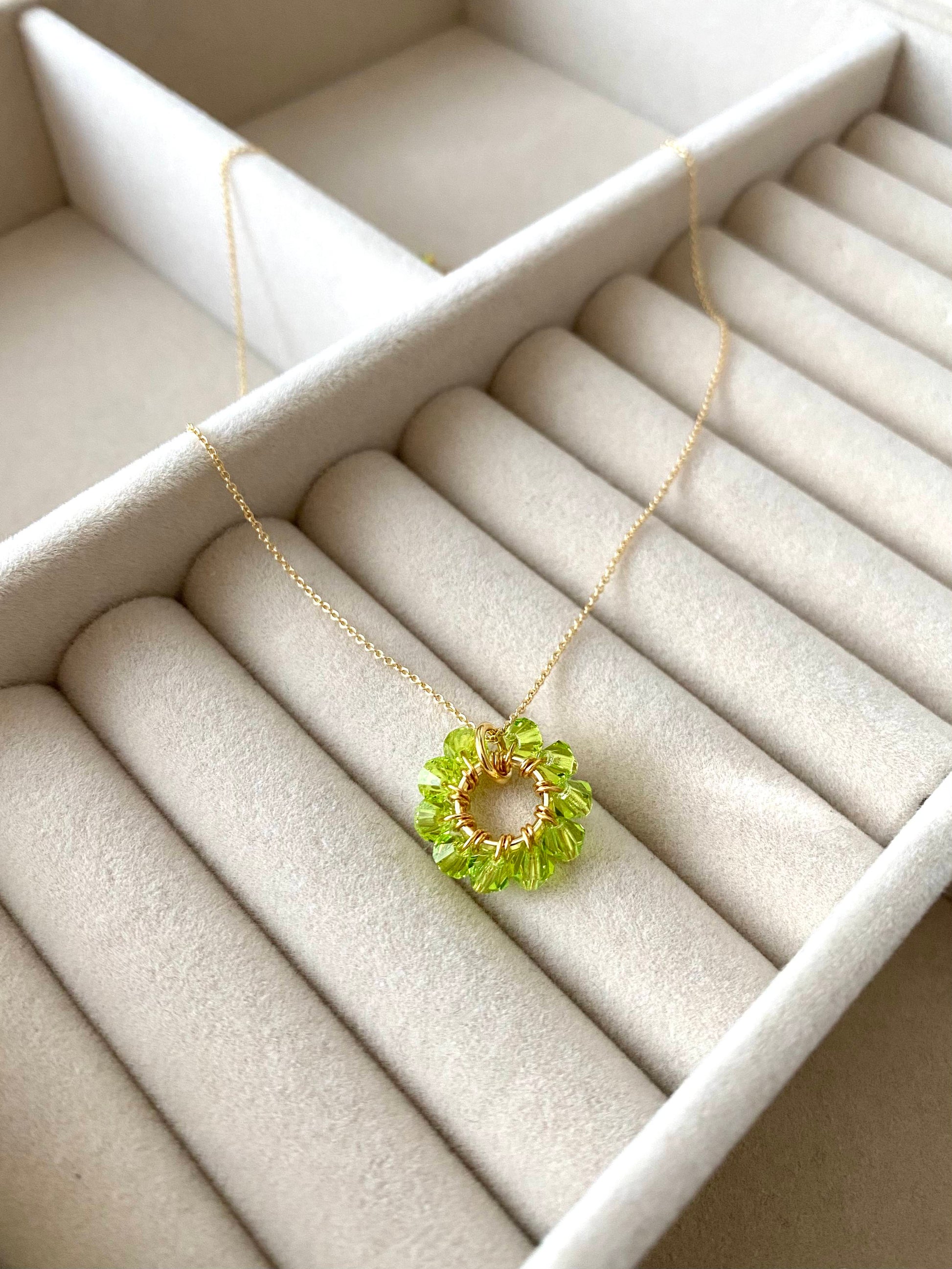 Kaulakoruketju on 18K kullattua 925 sterling hopeaa. Kristallilasihelmet ovat käsin kierretty 24K kullatulla kuparilangalla kullatun hopearenkaan ympärille. Riipusrenkaan halkaisija on 1,5 cm ja kaulakoruketjun pituus 40 cm + 3 cm säätövara.