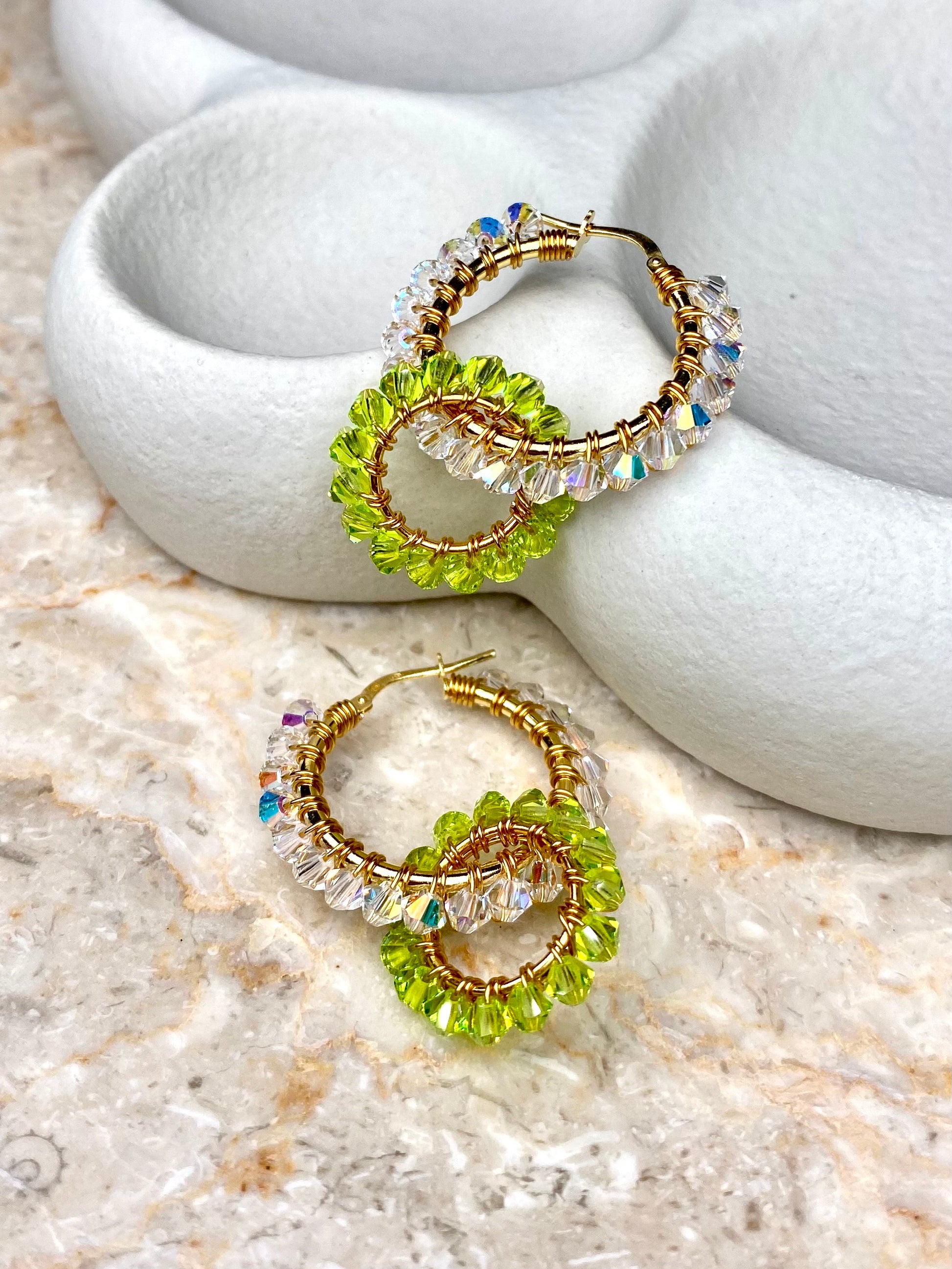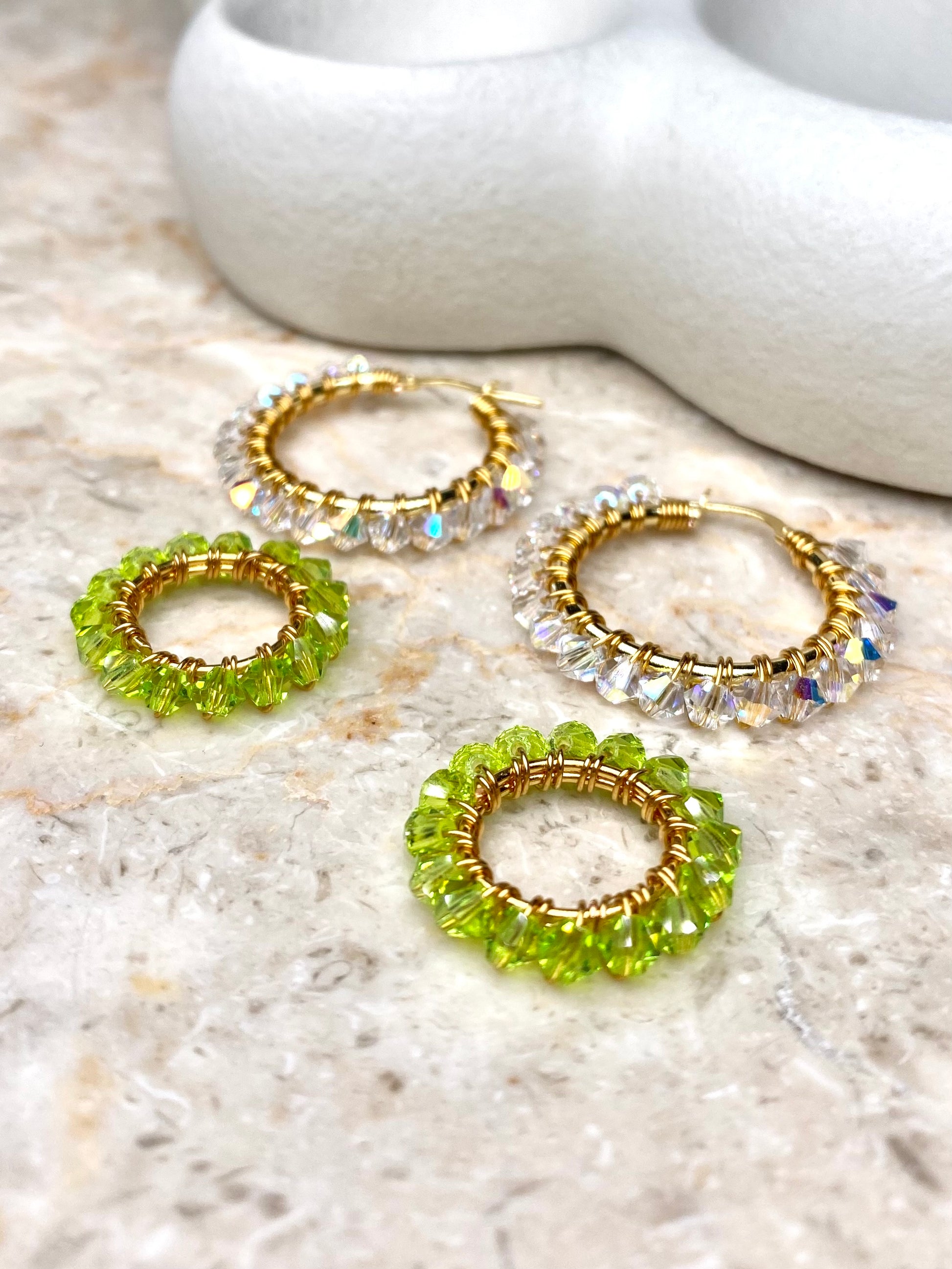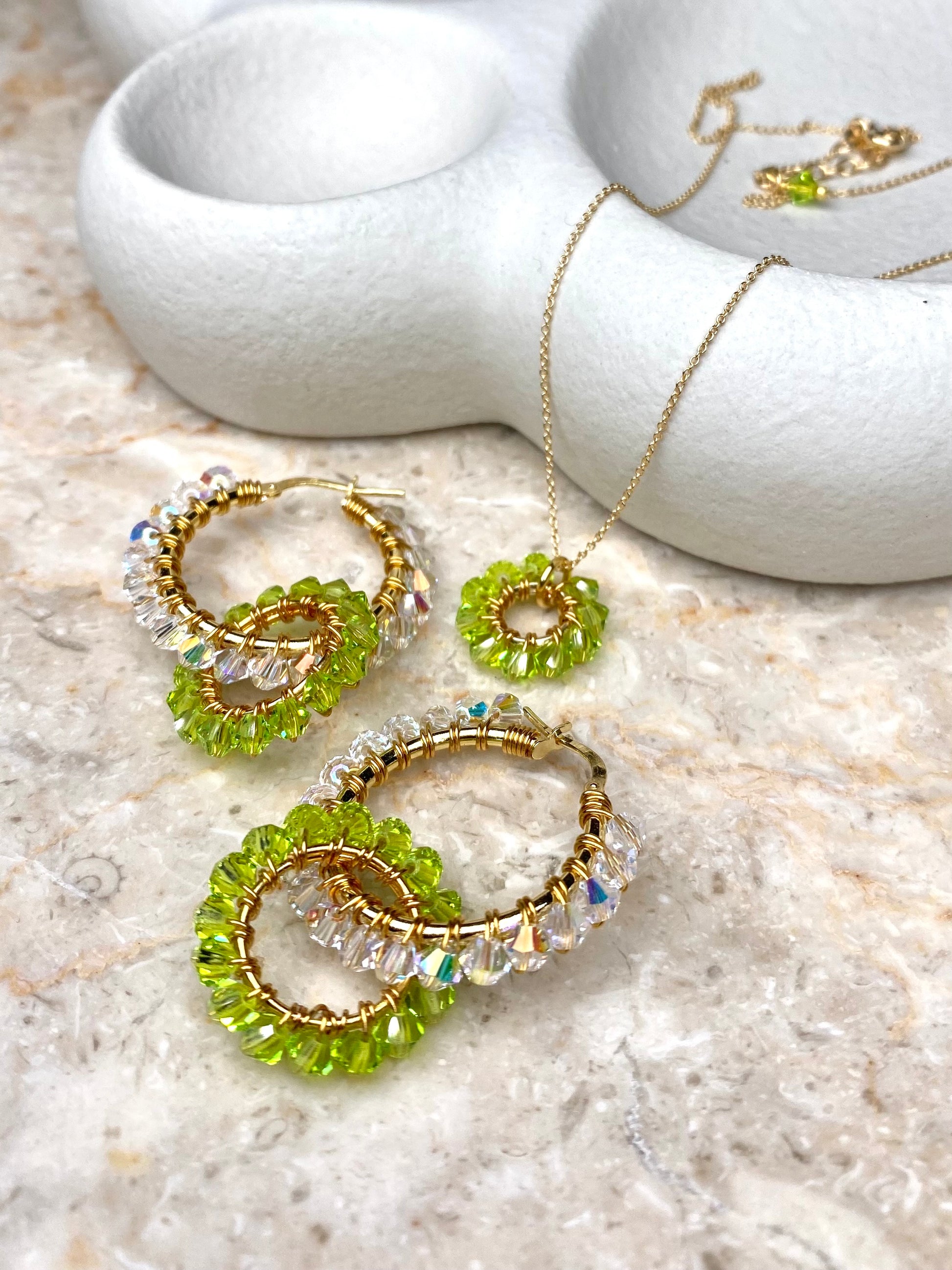 Korvakorurenkaat ovat 14K kullattua 925 sterling hopeaa. Ne on käsitelty suojakerroksella, joka ehkäisee pinnoitteen kulumista ja parantaa korun kestävyyttä. Tsekkiläiset kristallilasihelmet on punottu 24K kullatulla kuparilangalla, jolla riipusrengas on myös käsin muotoiltu.