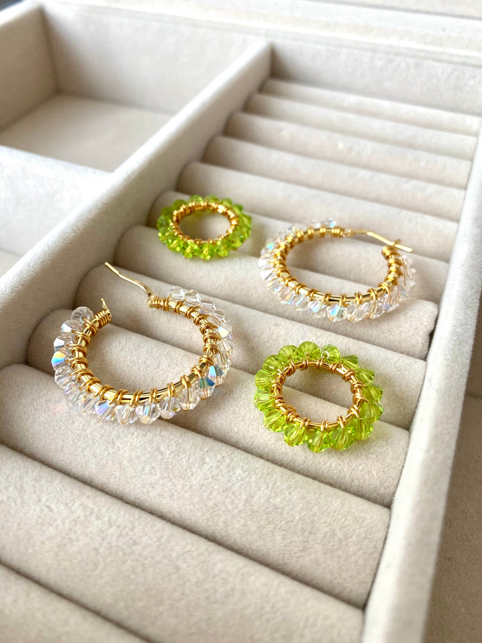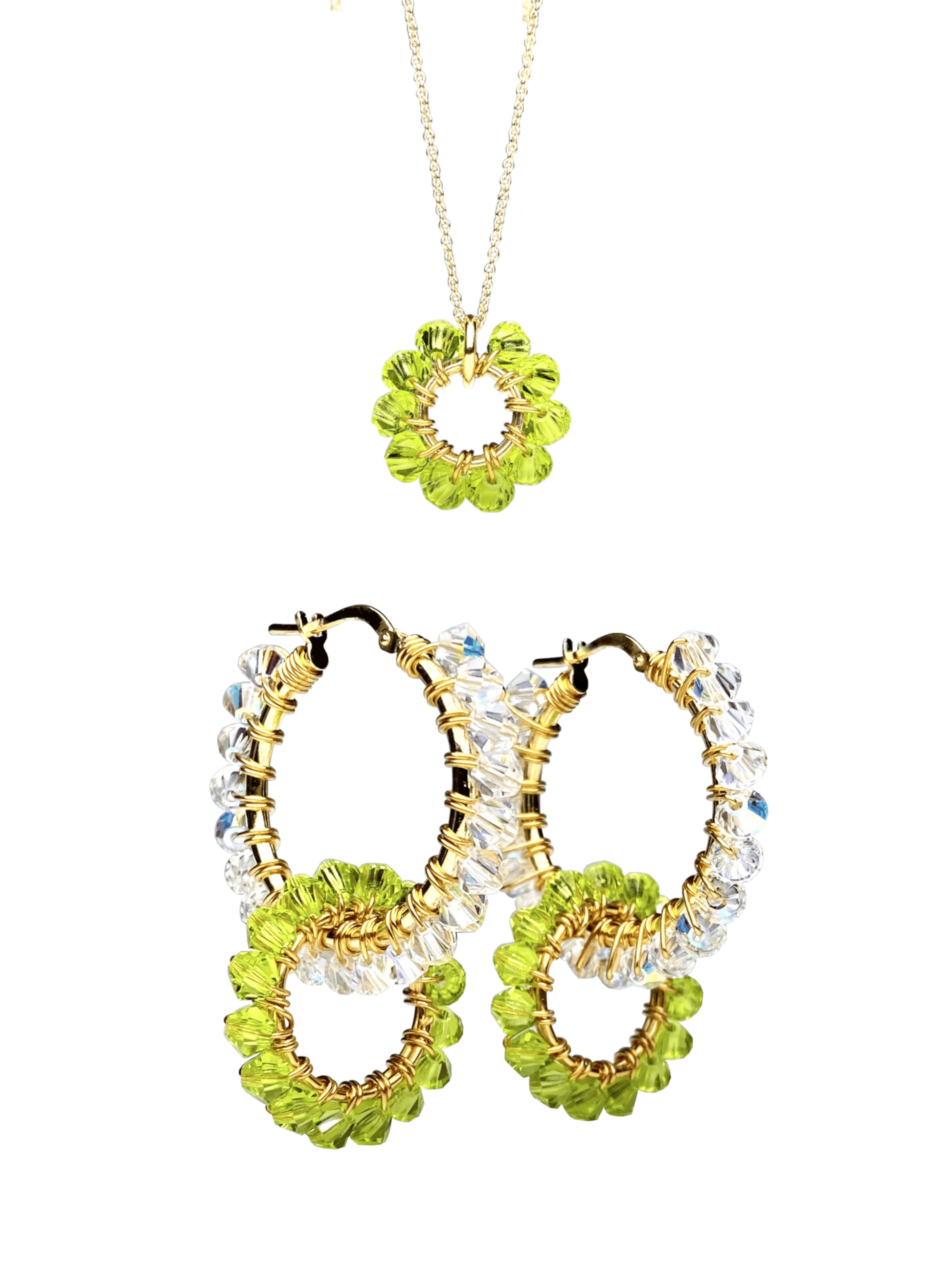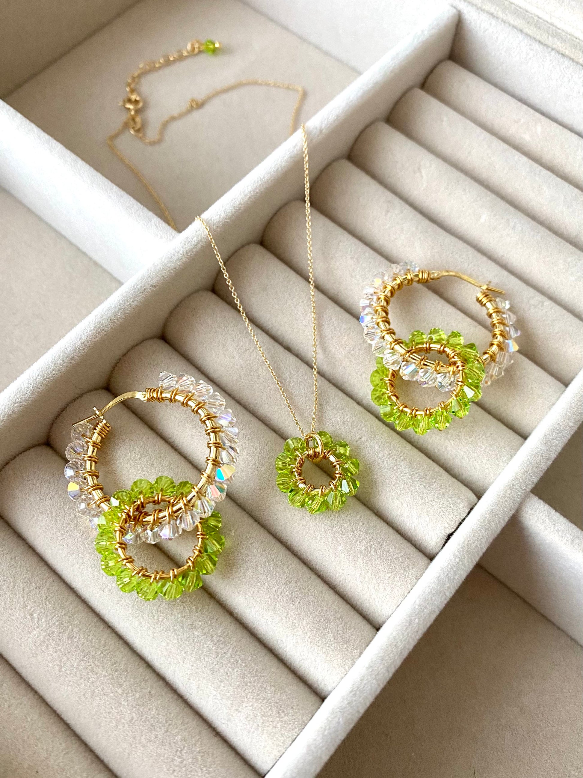Korvakorurenkaat ovat 14K keltakullalla pinnoitettua 925 sterling hopeaa. Ne ovat käsitelty suojakerroksella, joka ehkäisee pinnoitteen kulumista ja parantaa korun kestävyyttä. Riipusrengas on käsin muotoiltu 24K kullatusta kuparilangasta ja jokainen kristallilasihelmi on niin ikään käsin kierretty riipuksen ja renkaiden ympärille yksitellen. Korvakorurenkaiden halkaisija on 25 mm ja riipuksen 14 mm.
