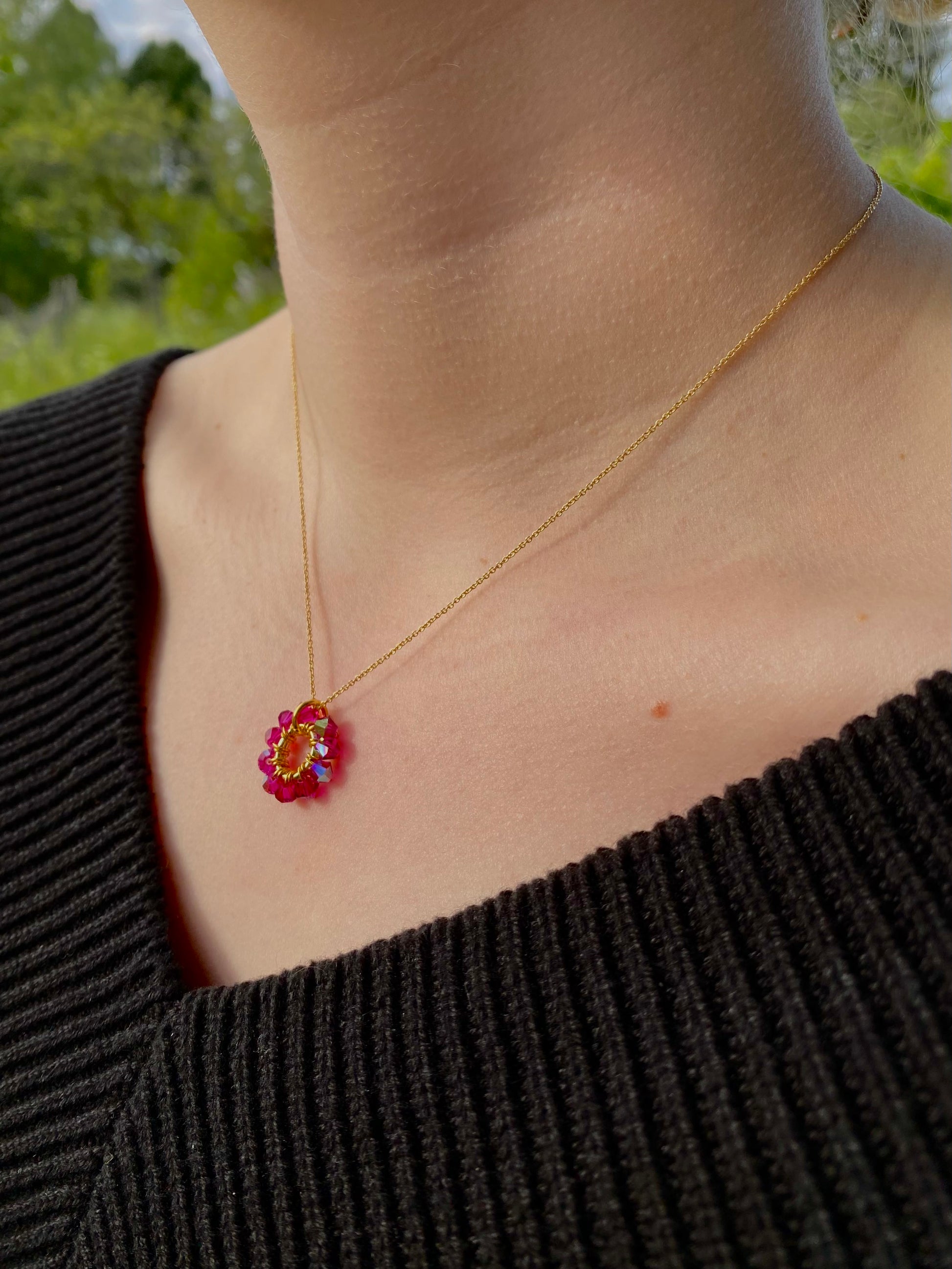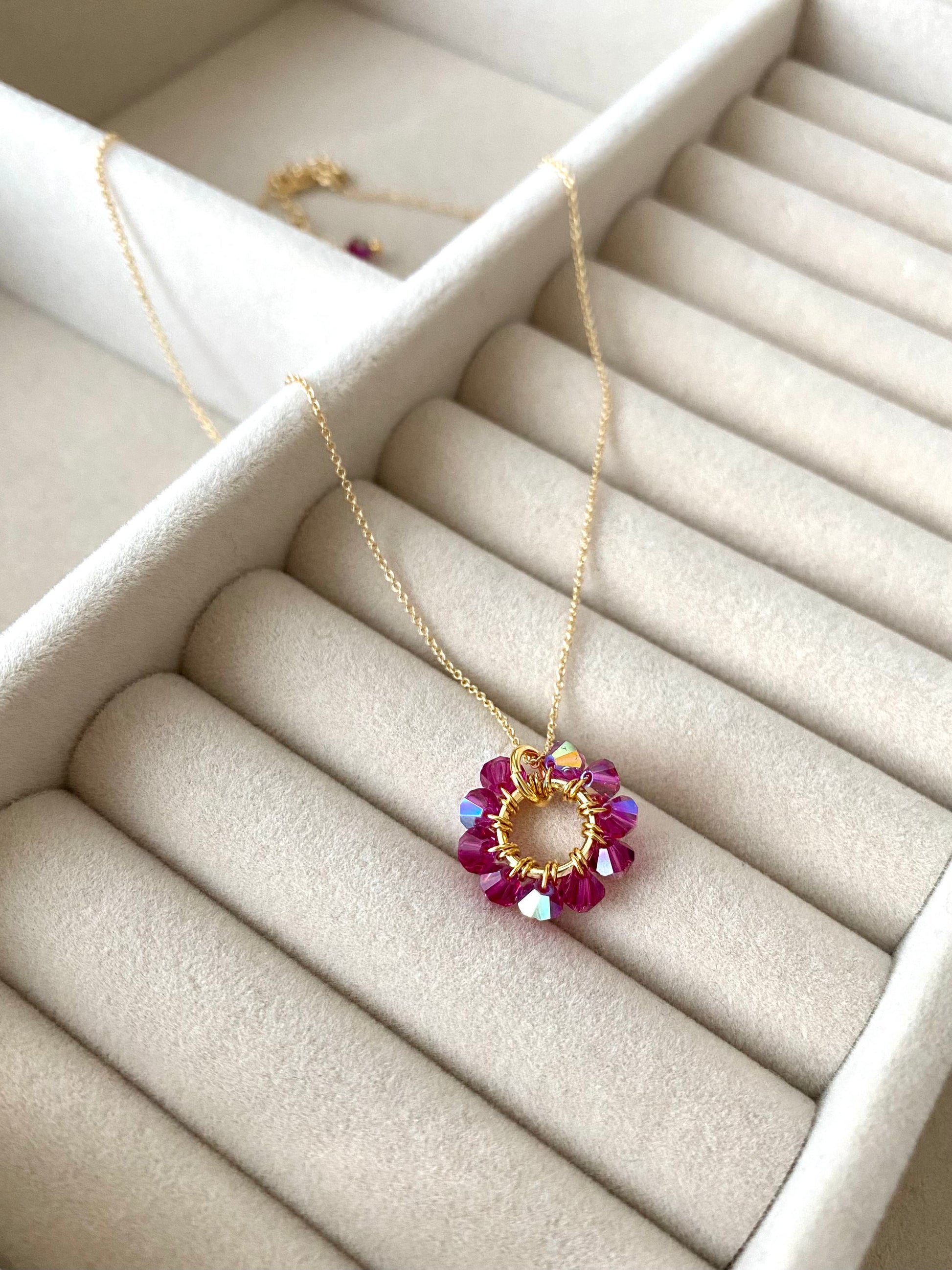 Kaulakoruketju on 18K kullattua 925 sterling hopeaa. Kristallilasihelmet ovat käsin kierretty 24K kullatulla kuparilangalla kullatun hopearenkaan ympärille. Riipusrenkaan halkaisija on 1,5 cm ja kaulakoruketjun pituus 40 cm + 3 cm säätövara.