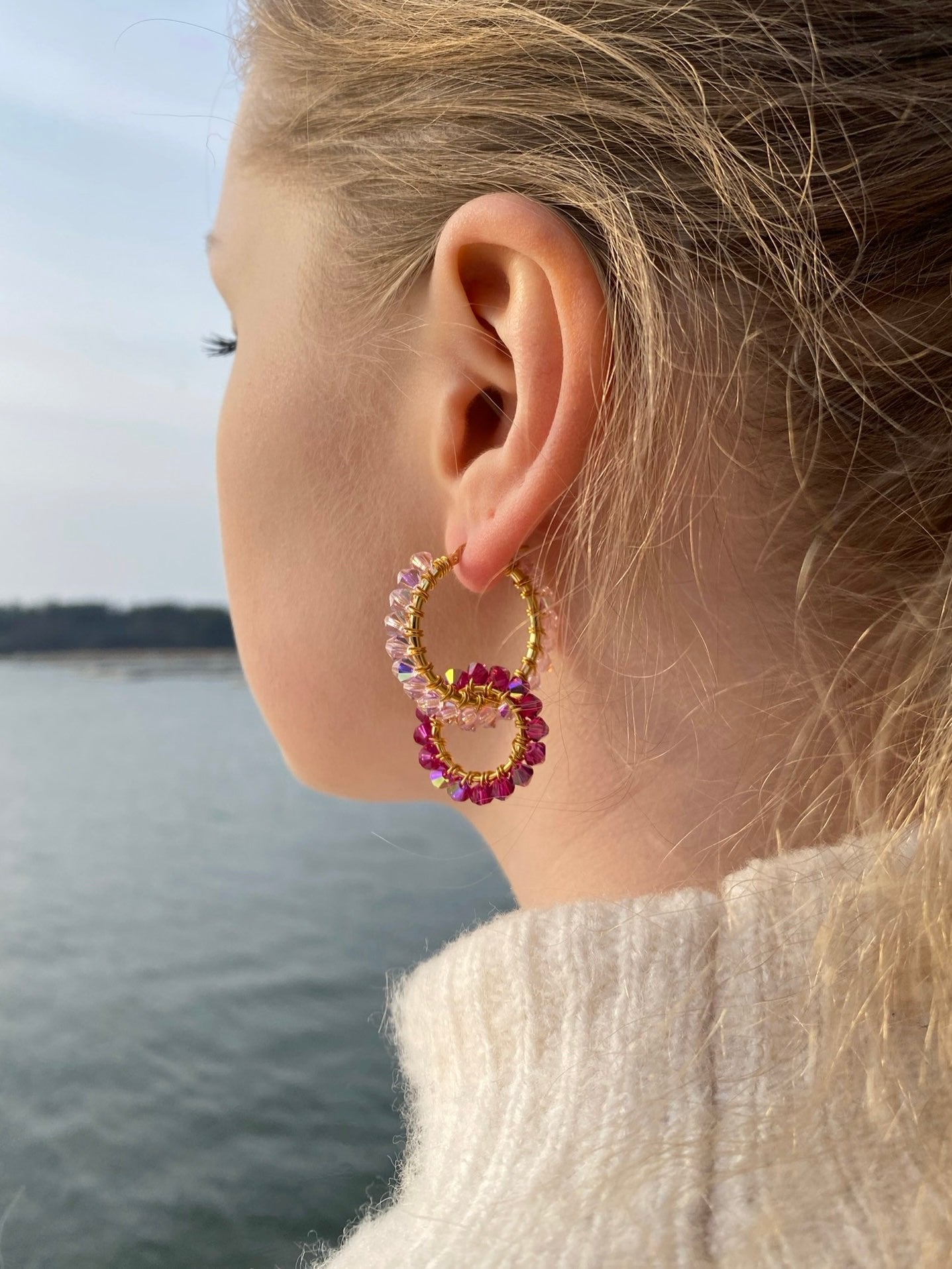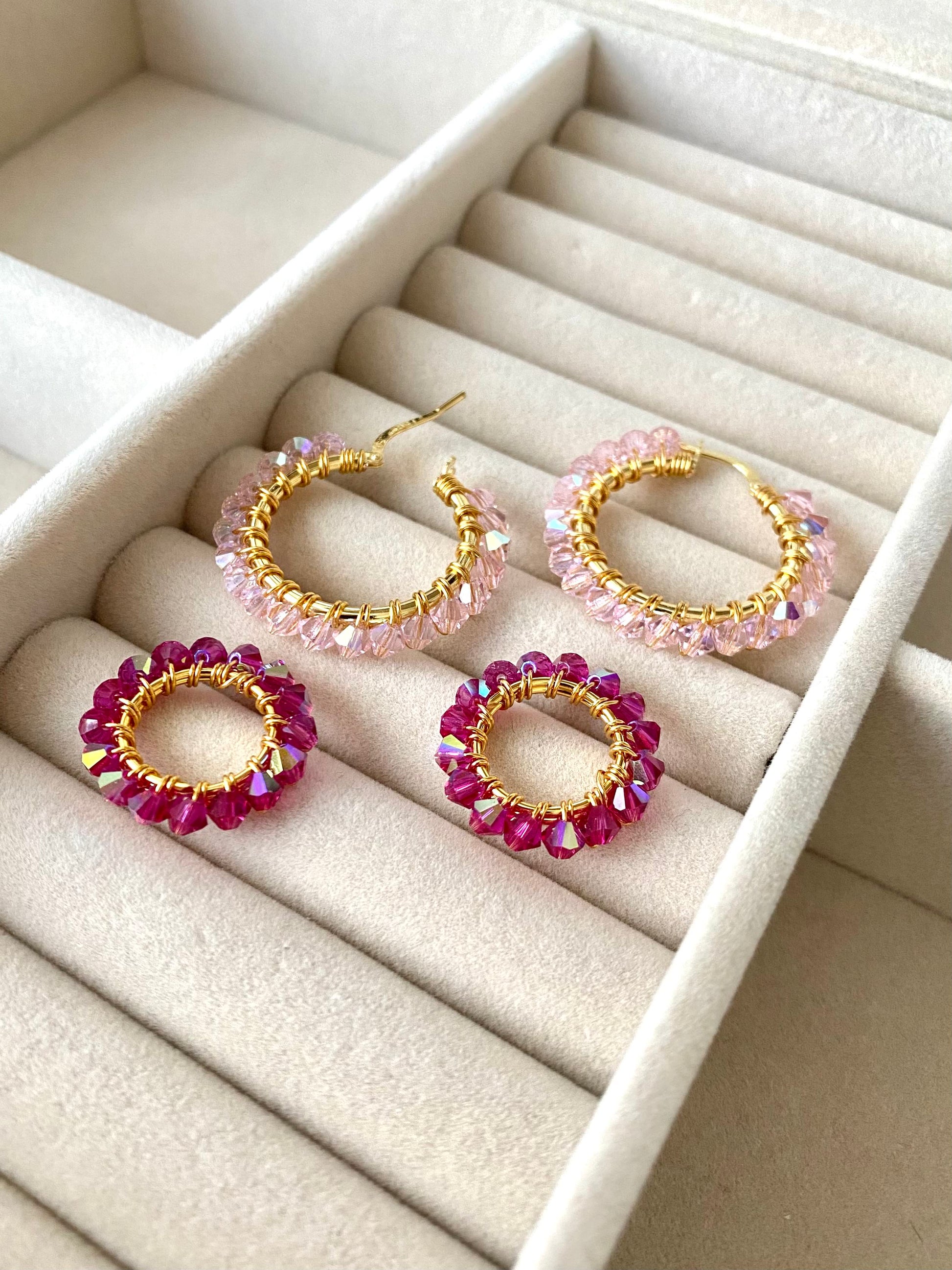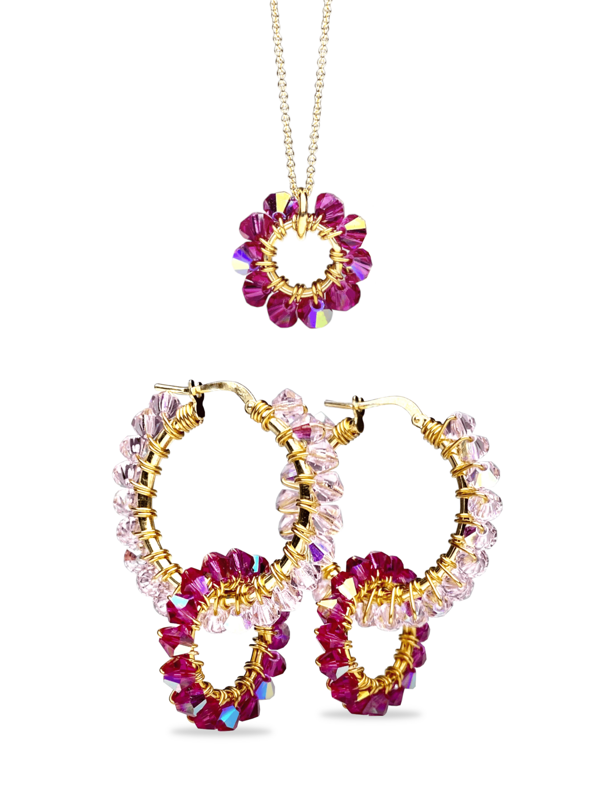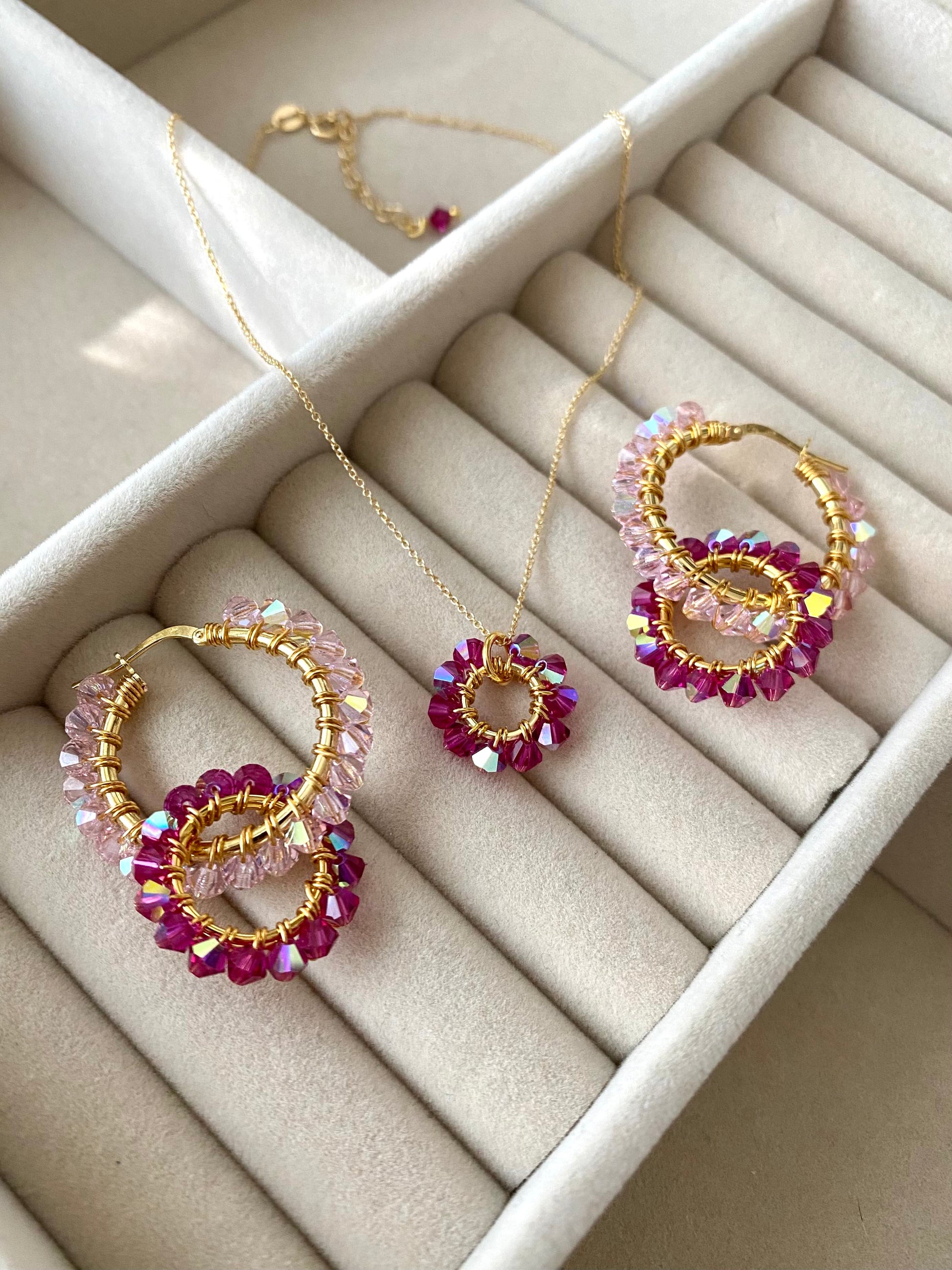 Korvakorurenkaat ovat 14K keltakullalla pinnoitettua 925 sterling hopeaa. Ne ovat käsitelty suojakerroksella, joka ehkäisee pinnoitteen kulumista ja parantaa korun kestävyyttä. Riipusrengas on käsin muotoiltu 24K kullatusta kuparilangasta ja jokainen kristallilasihelmi on niin ikään käsin kierretty riipuksen ja renkaiden ympärille yksitellen. Korvakorurenkaiden halkaisija on 25 mm ja riipuksen 14 mm.